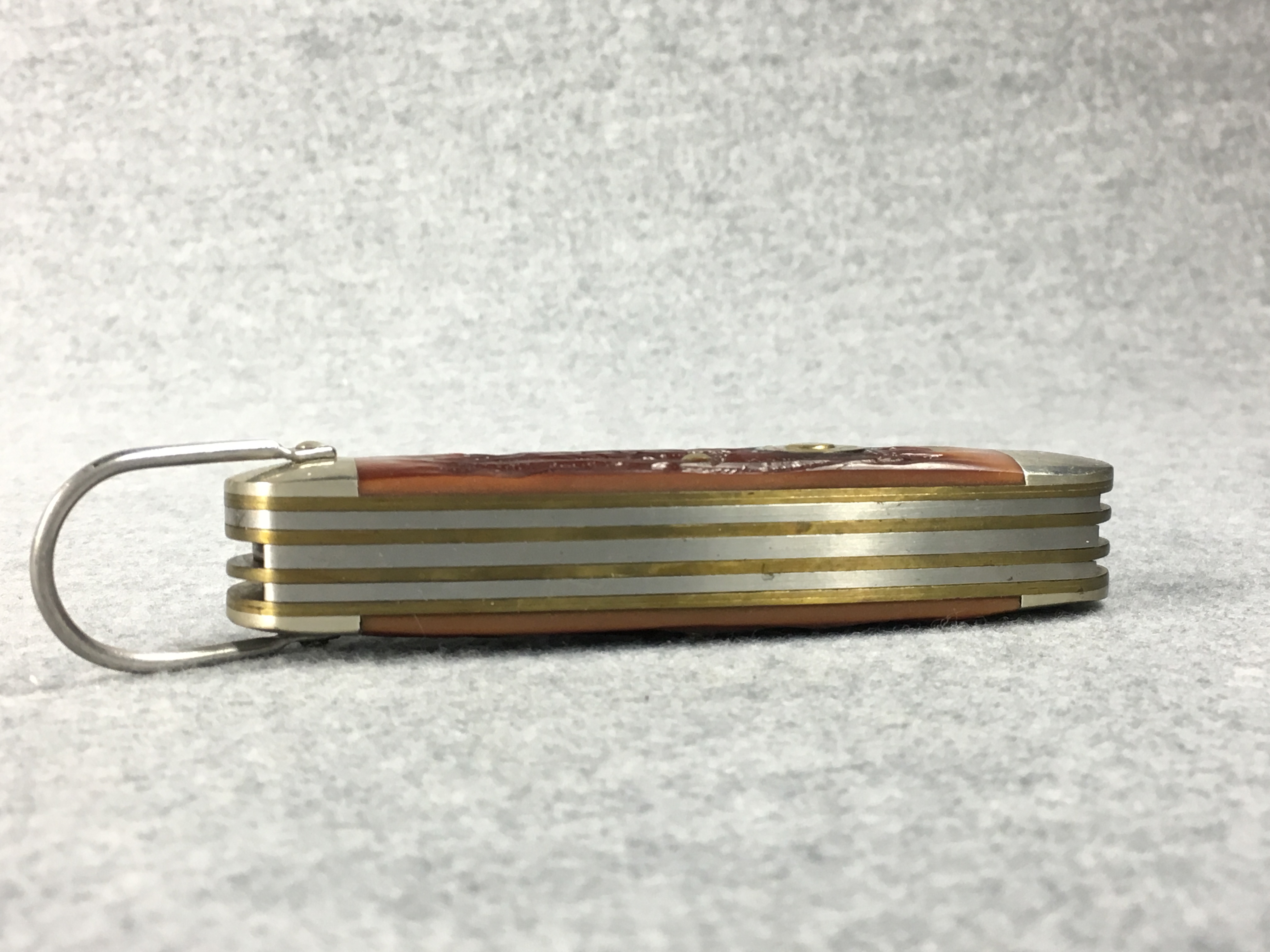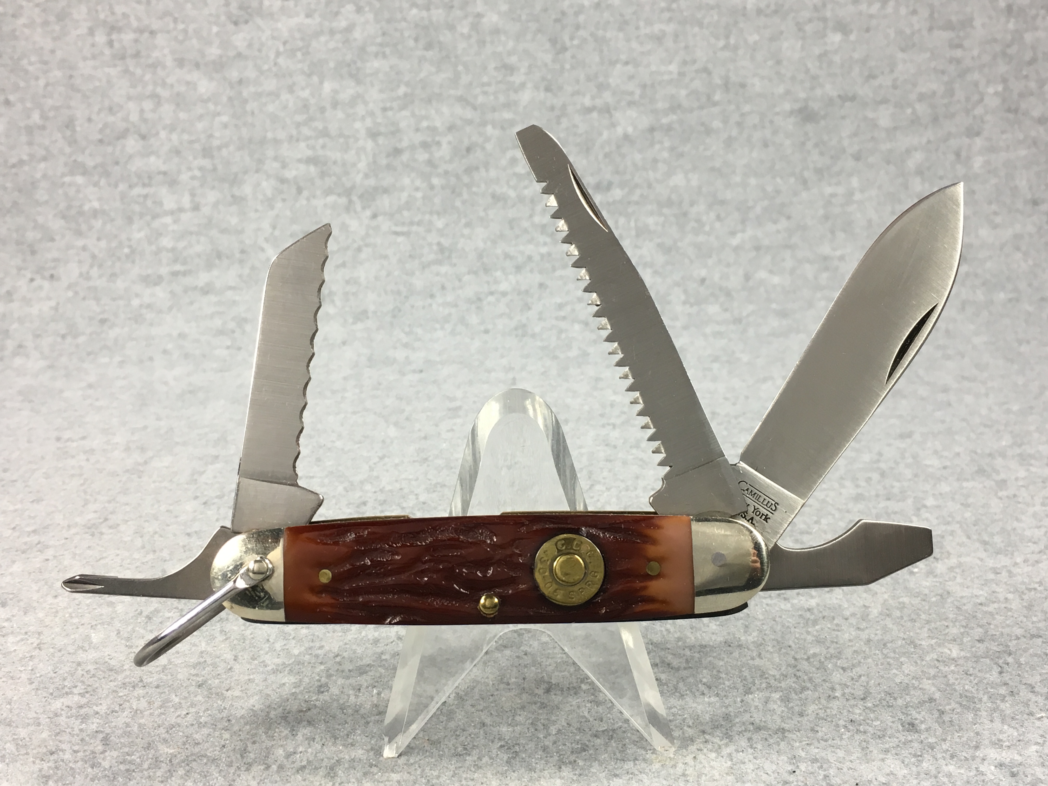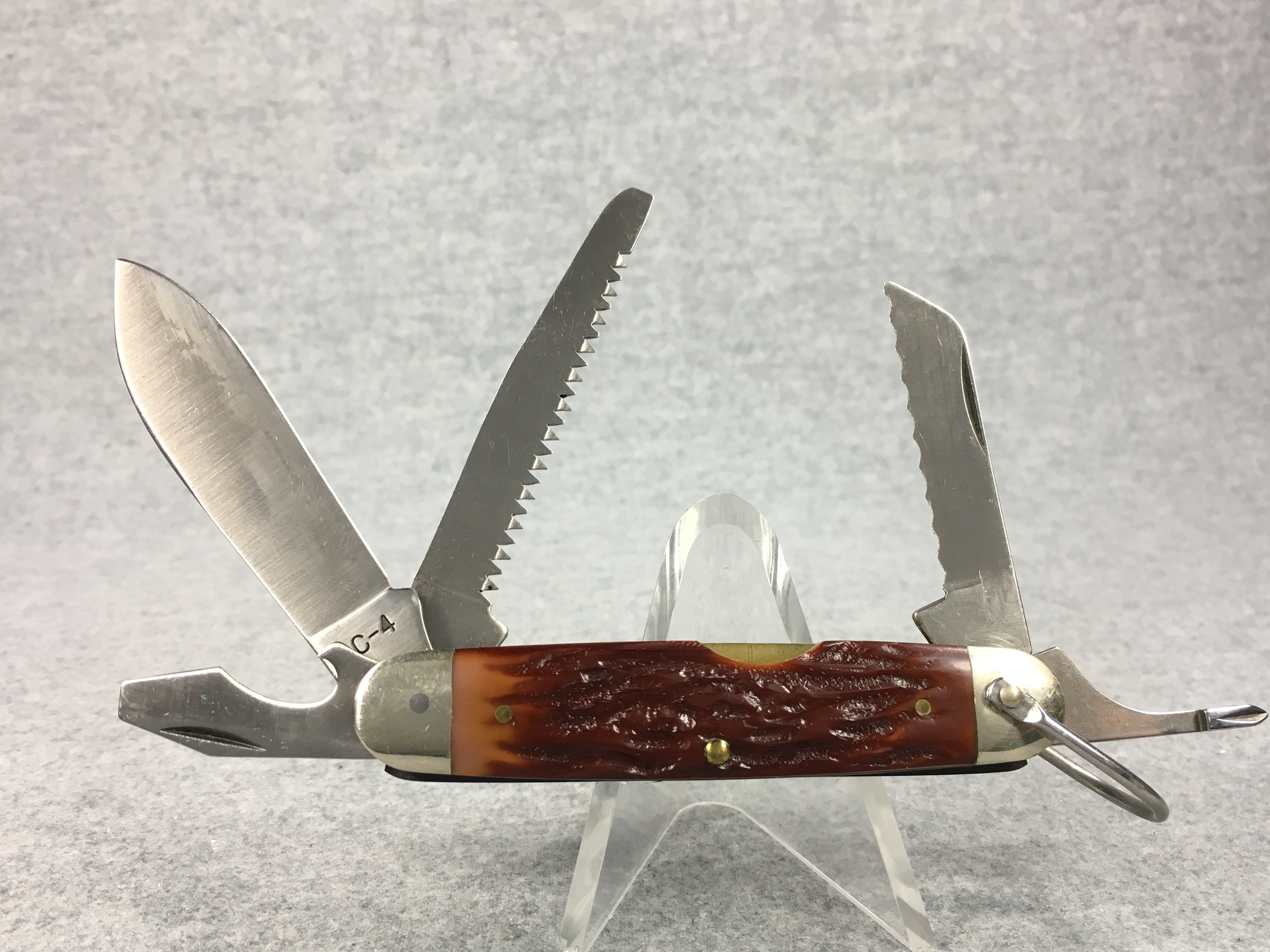 October 26, 2025 - 3-3/4 inches closed. 6-3/4 inches open. "CAMILLUS New York USA" and "C-4" tang stamps. Shotgun shell "30-06 SPRG CCC" shield. Imitation jigged bone handle. Nickel silver bolsters. Brass liner. No box.
