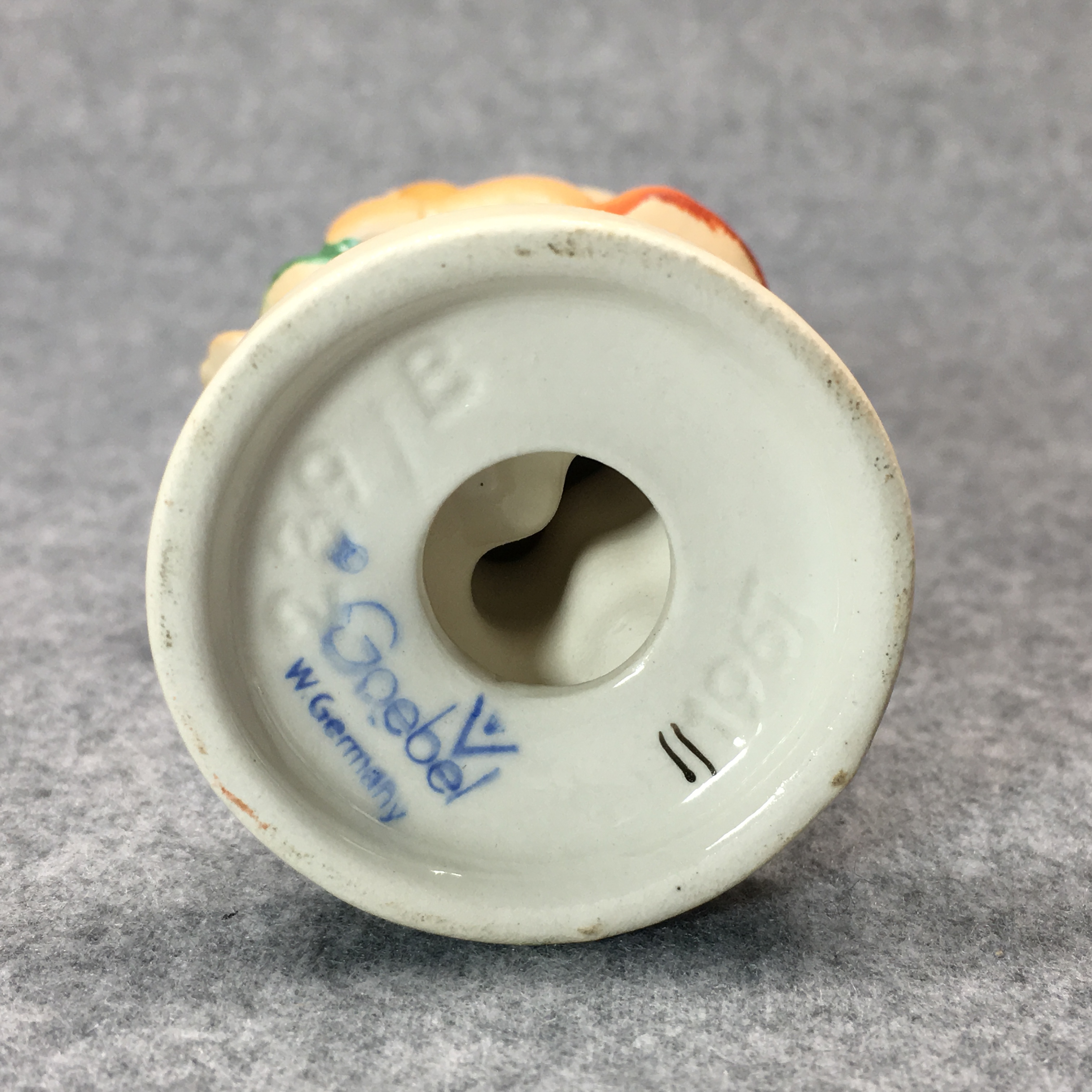 3-1/4 inches tall. Base is incised 239/B and 1967. Goebel TMK 5 trademark imprinted in blue on bottom of base. Painter hand-initialed in black ink on bottom of base.