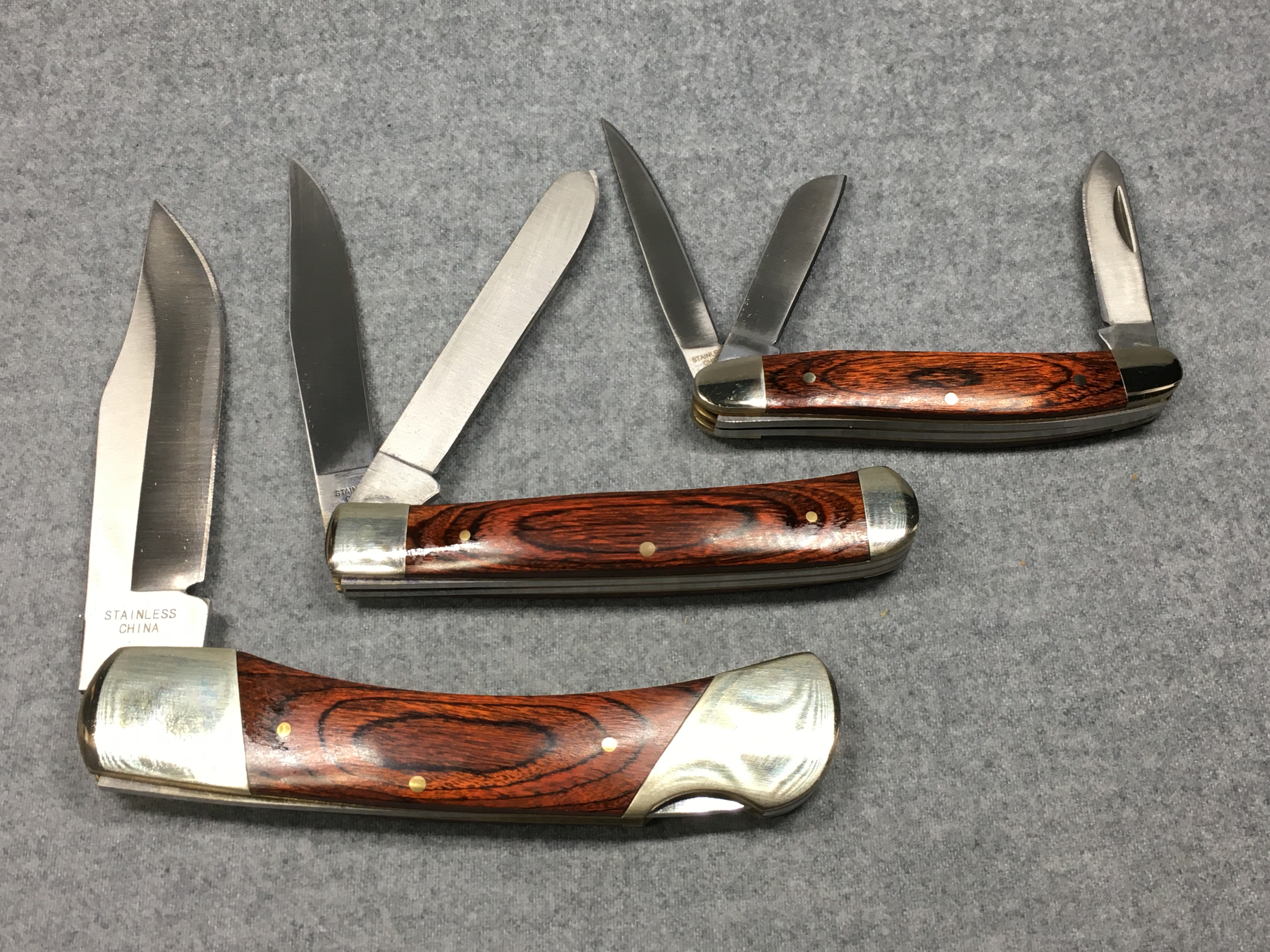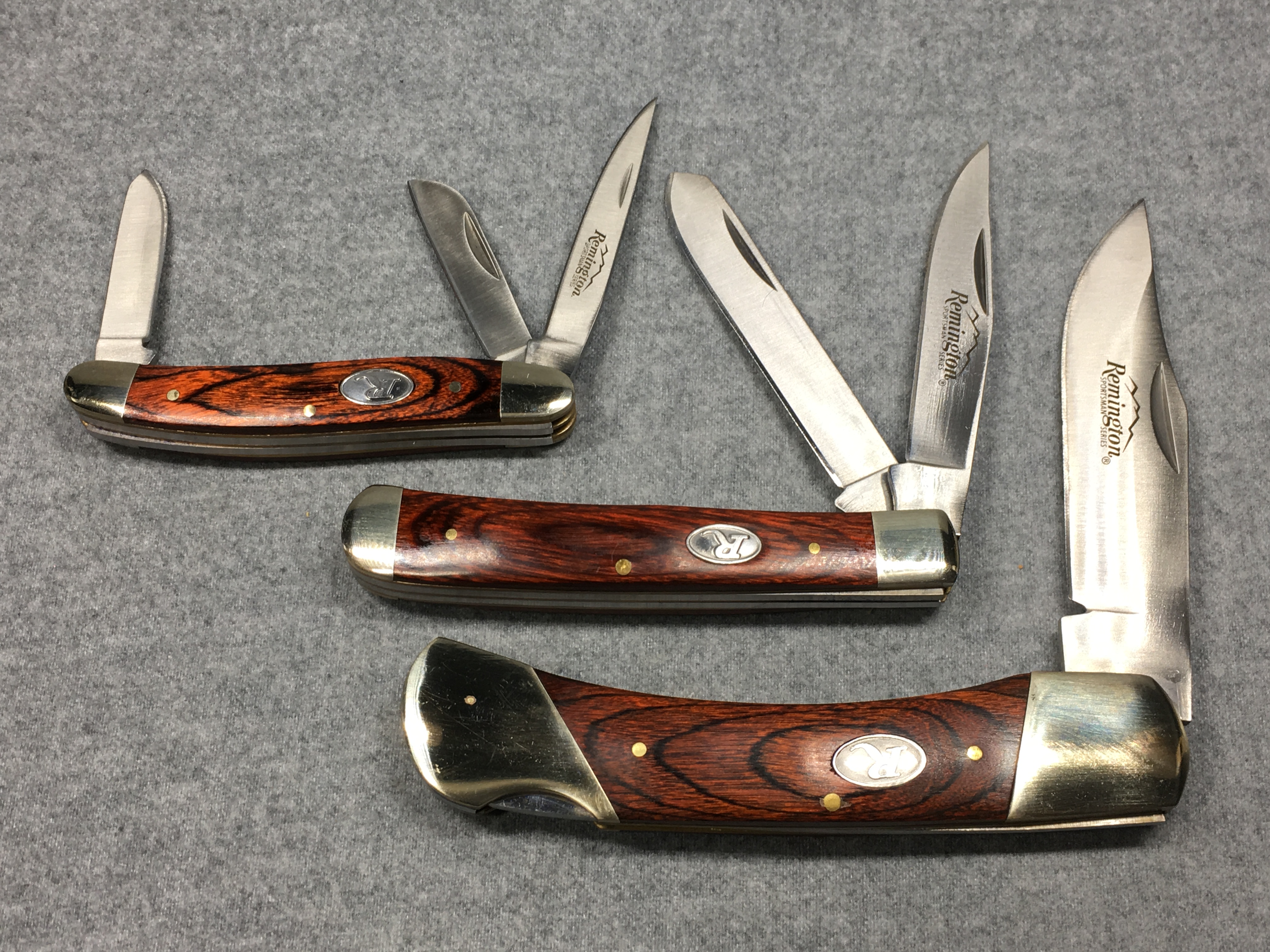 December 24, 2025 - 3-blade stockman knife is 3-1/2 inches closed, 6-1/8 inches open. 2-blade pocket knife is 3-1/2 inches closed, 6-1/4 inches open. Circle "R" Sportsman Series shields. Stainless Steel blades etched "Remington Sportsman Series". Wood handles. Nickel silver bolsters. Brass liners. With Collectors Tin.