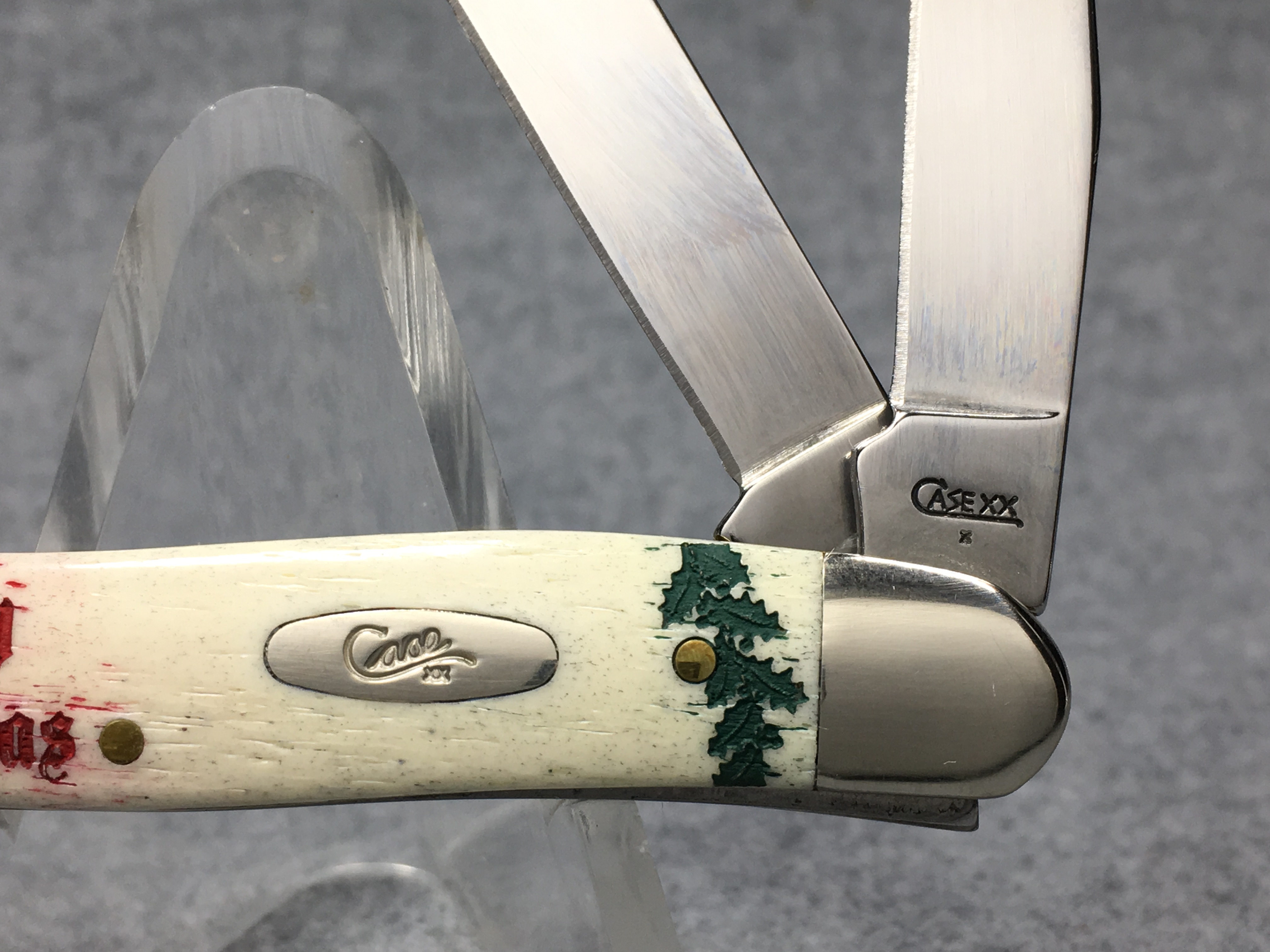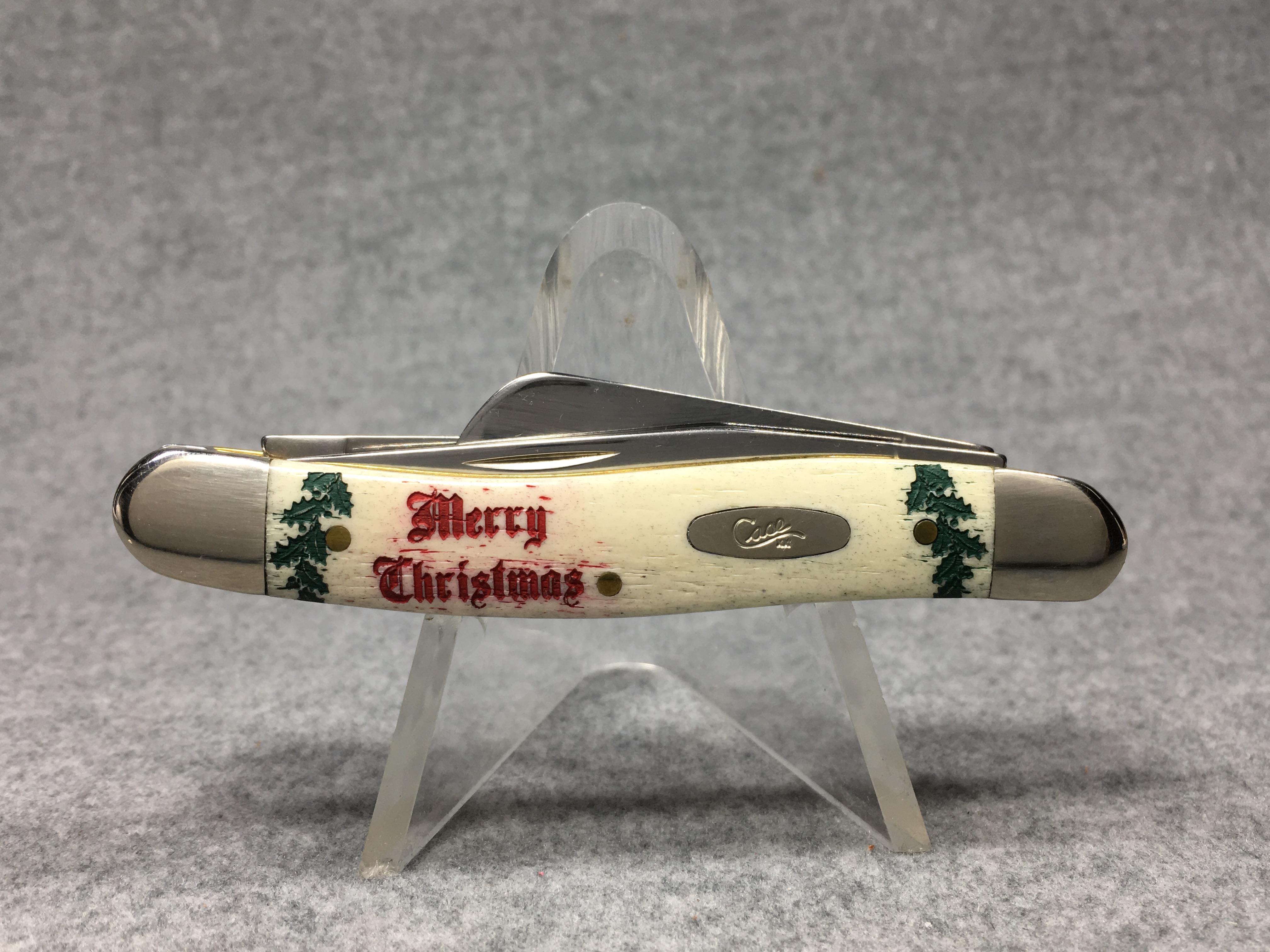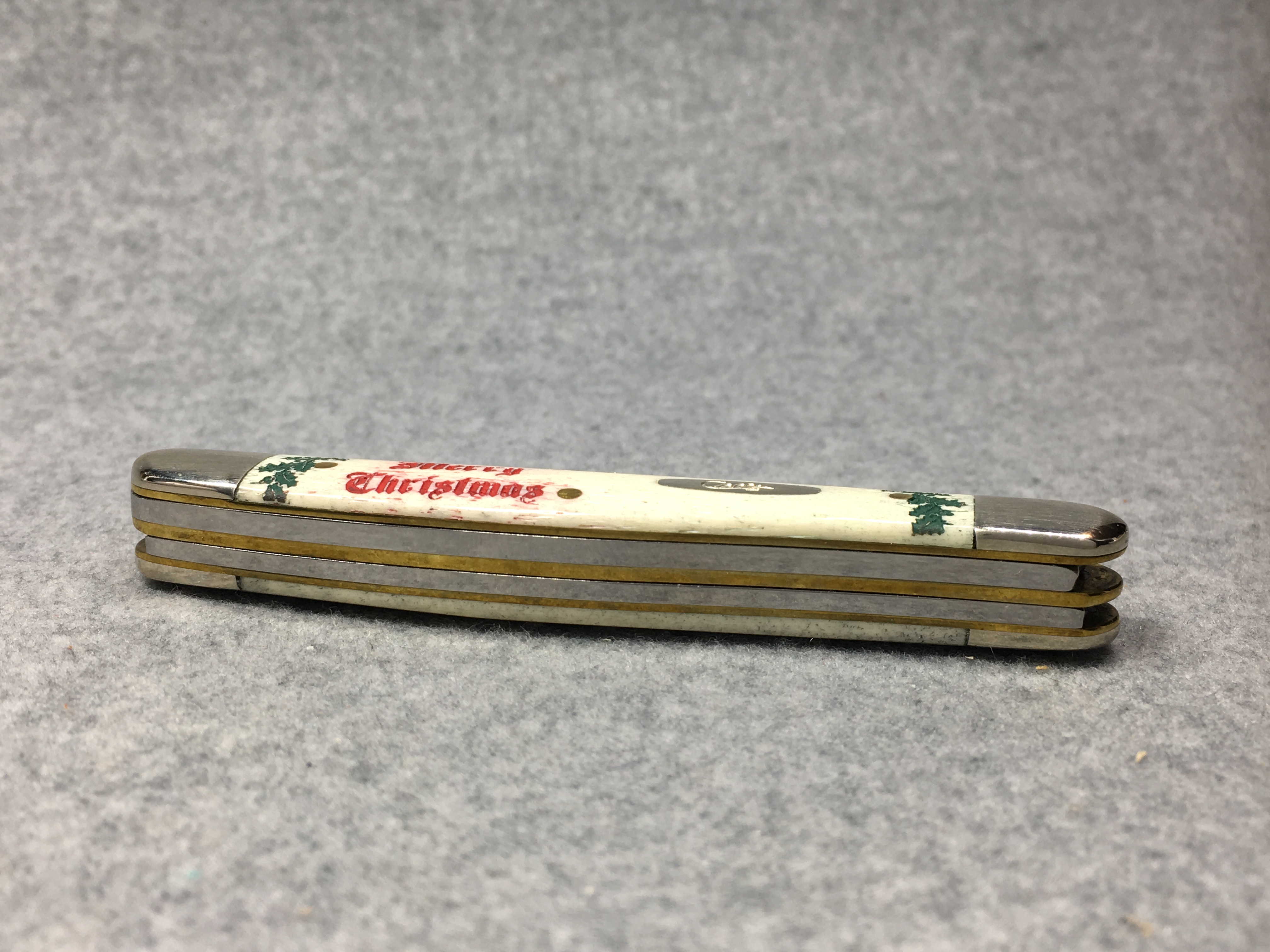 December 04, 2025 - 3-1/8 inches closed. 6-1/8 inches open. Made in USA. "        CASE XX    x   " and "USA 6318 SS" tang stamps. Single Oval 'Long C' Case XX shield. Stainless Steel blades. Natural Smooth Bone handle laser-etched "Merry Christmas" in red and green holly leaves. Nickel Silver bolsters. Brass liner.