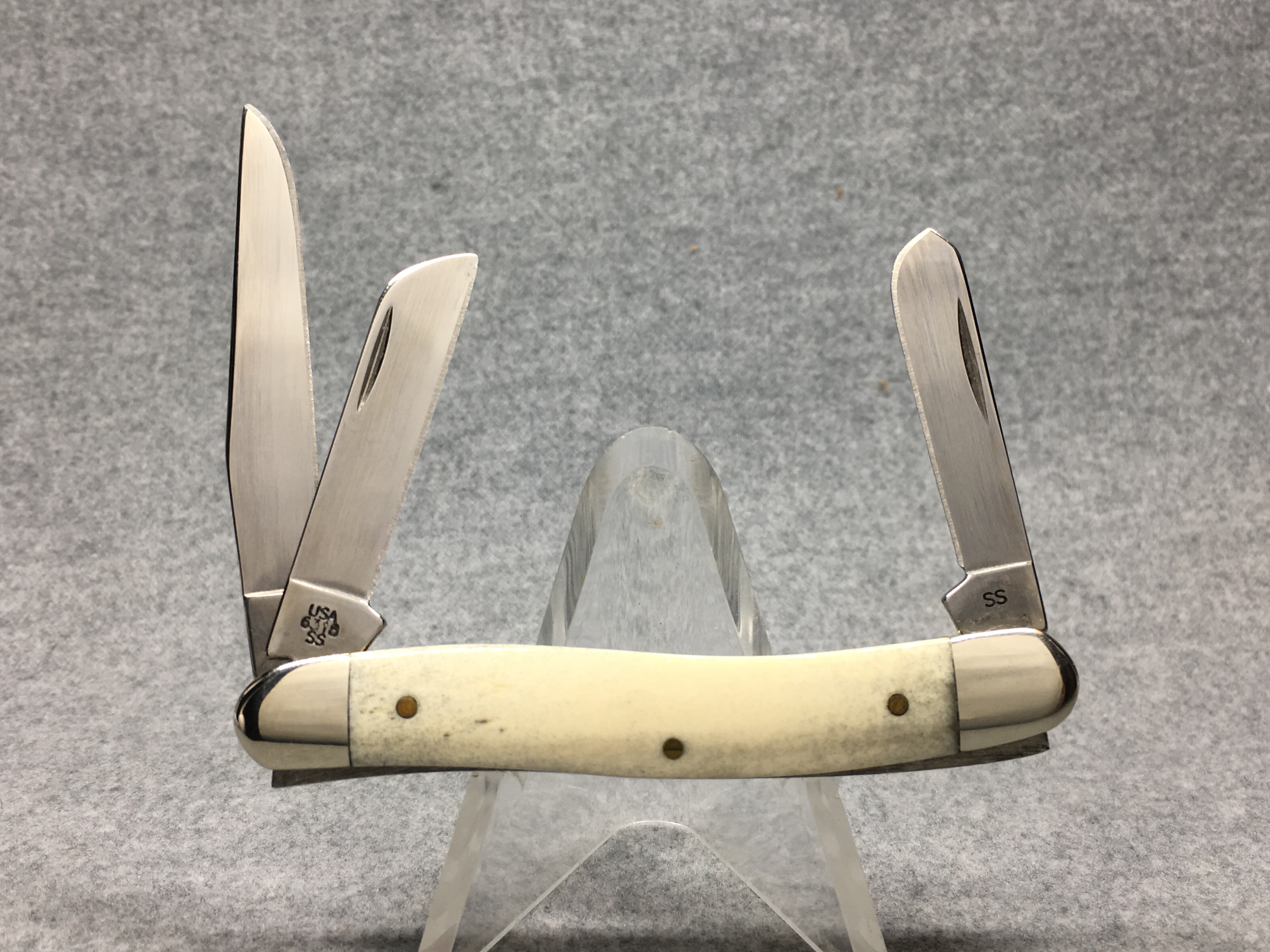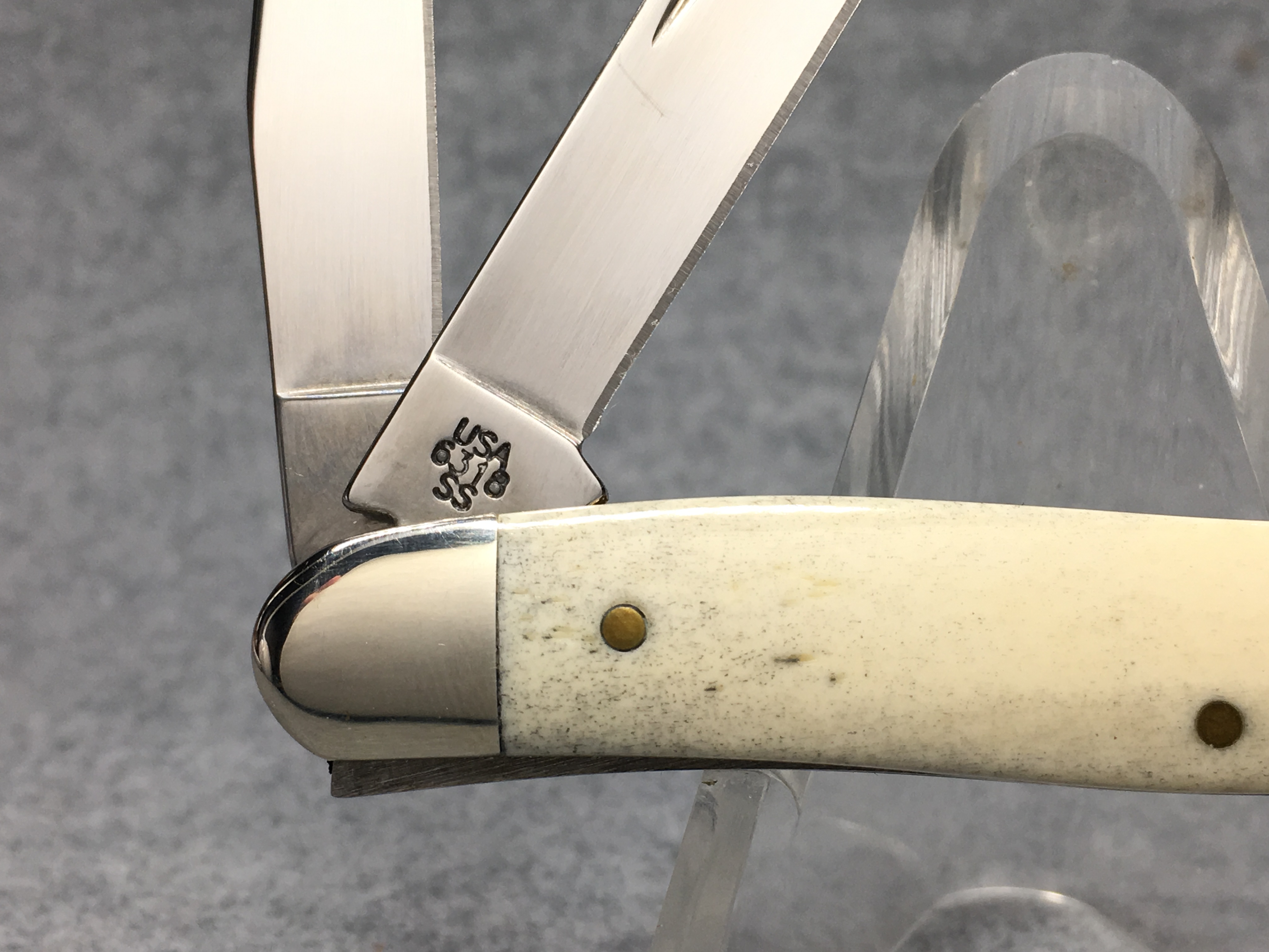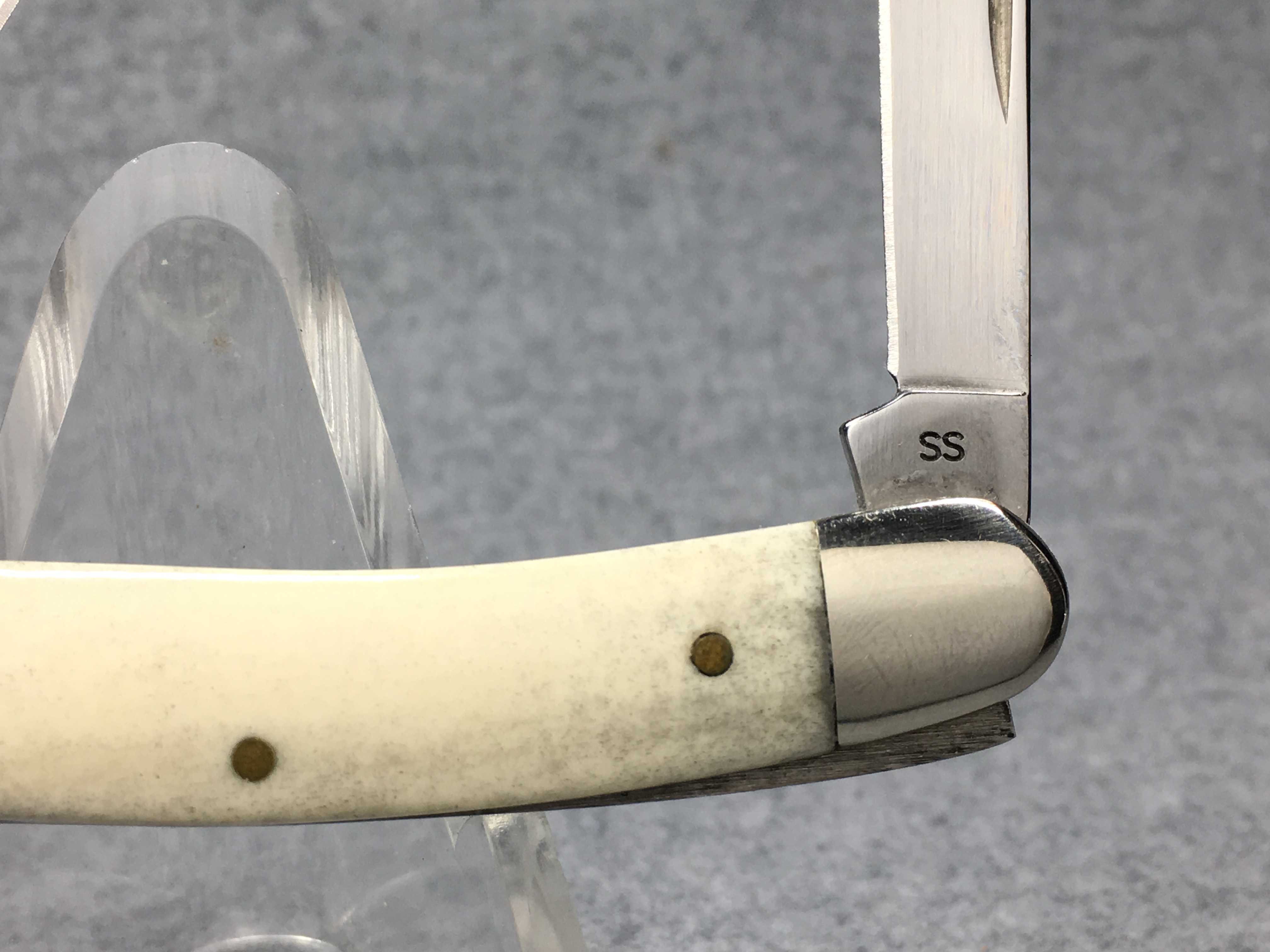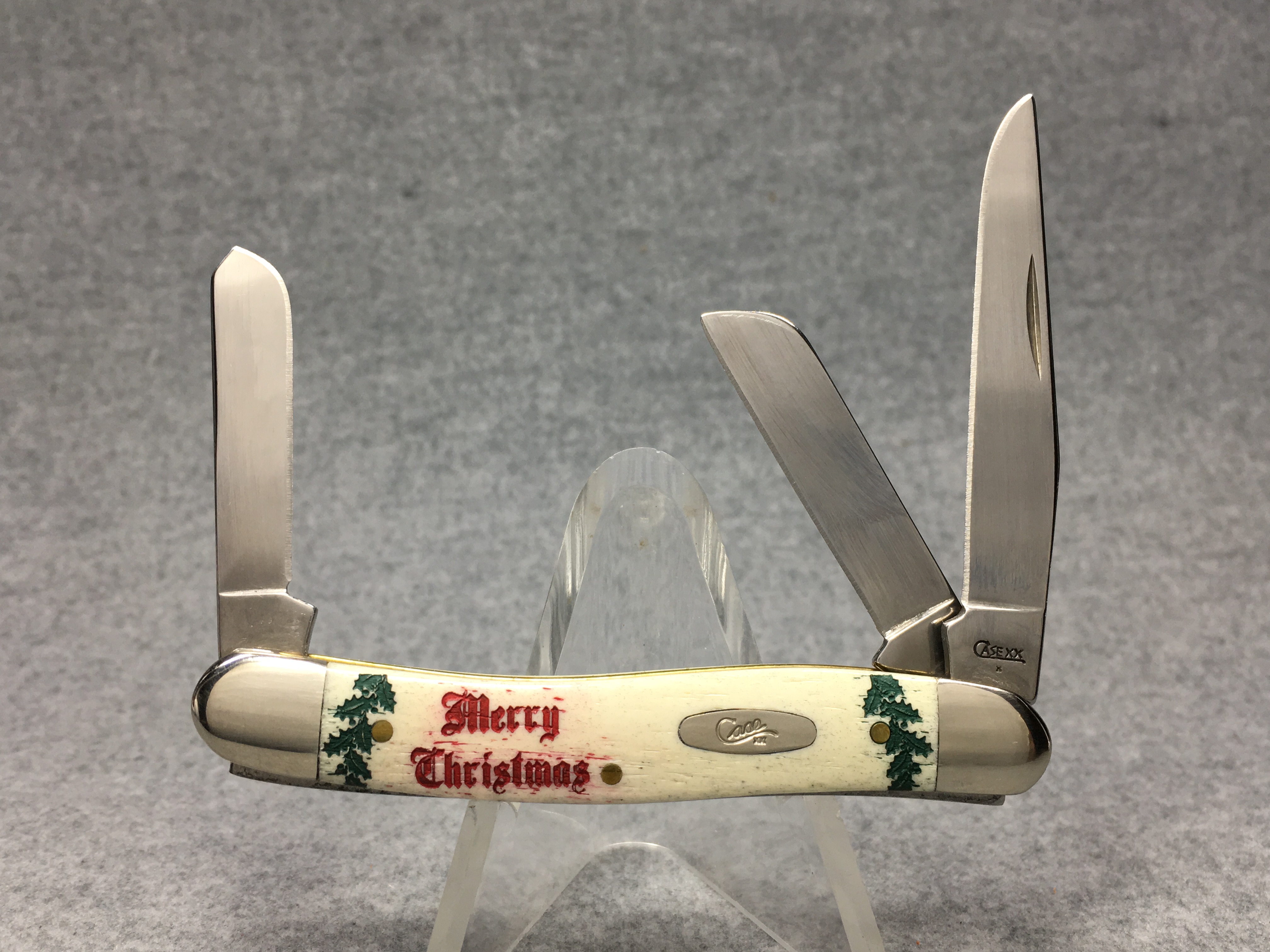 December 04, 2025 - 3-1/8 inches closed. 6-1/8 inches open. Made in USA. "        CASE XX    x   " and "USA 6318 SS" tang stamps. Single Oval 'Long C' Case XX shield. Stainless Steel blades. Natural Smooth Bone handle laser-etched "Merry Christmas" in red and green holly leaves. Nickel Silver bolsters. Brass liner.