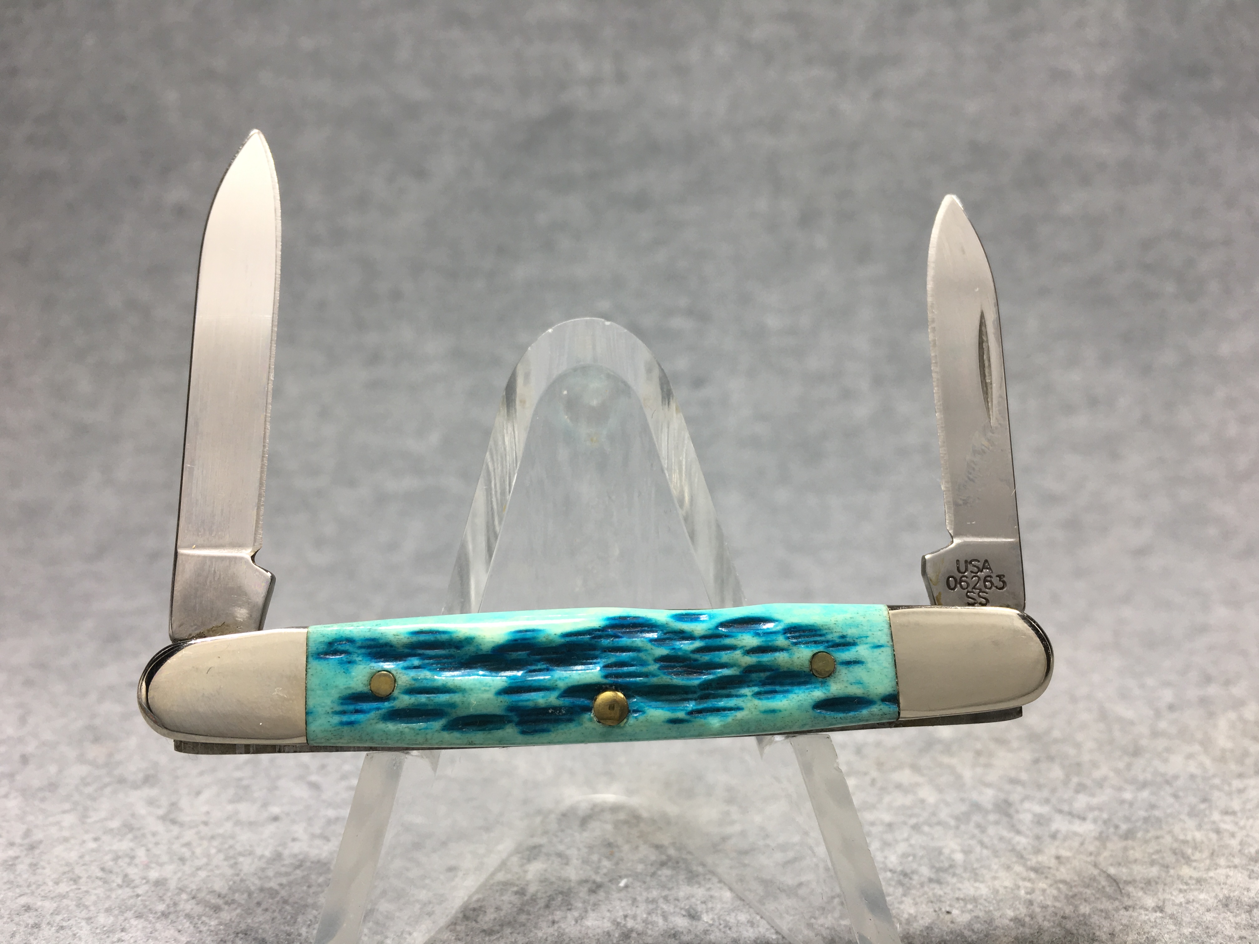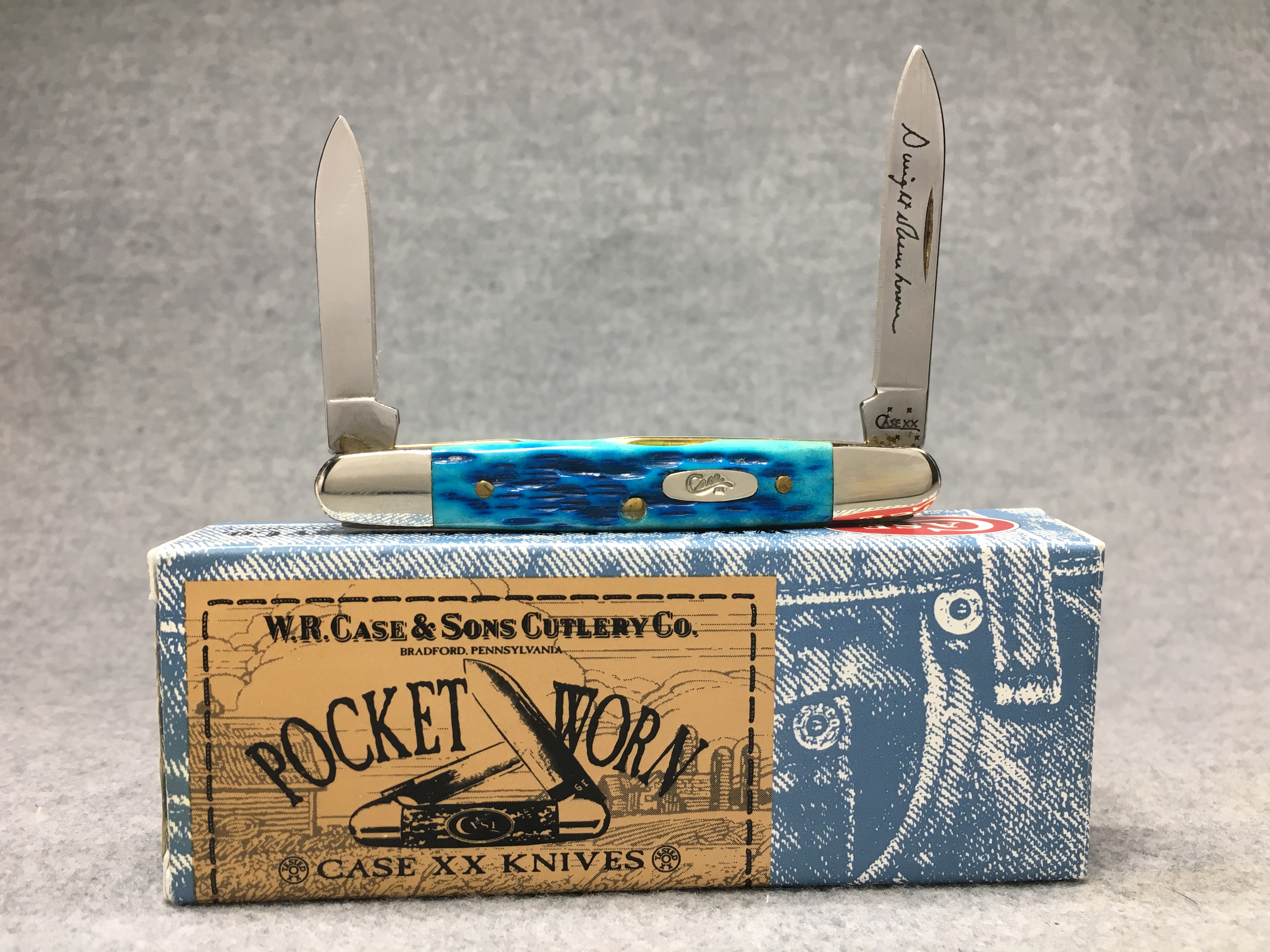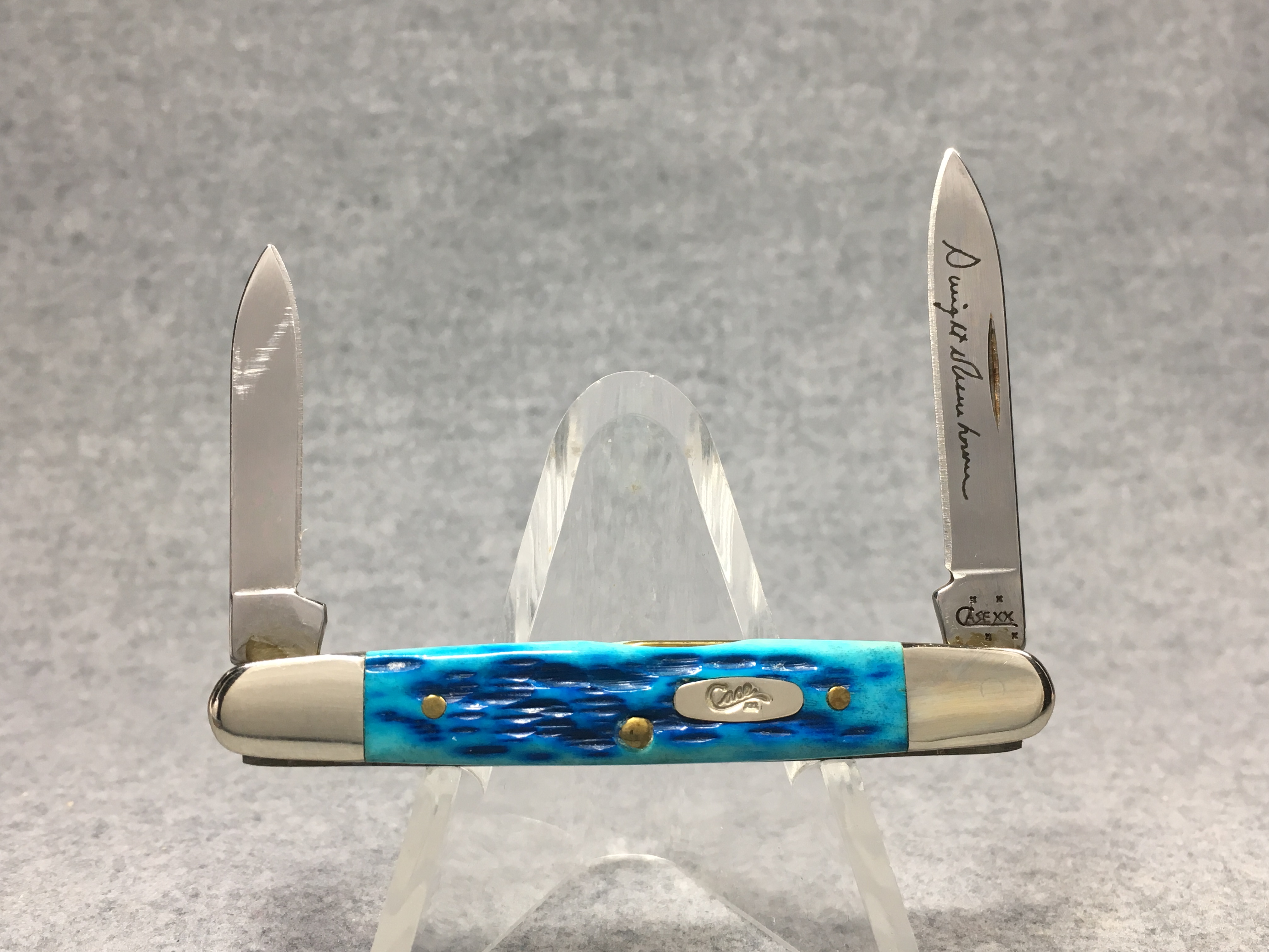 April 05, 2026 - 3-1/8 inches closed. 4-7/8 inches open. Made in USA. "CASE XX  x x " and "USA 06263 SS" tang stamps. Oval long-C script "Case xx" shield. Stainless Steel blades. Master blade etched with Dwight Eisenhower's signature. Caribbean blue jigged bone handle. Nickel Silver bolsters. Brass liner.