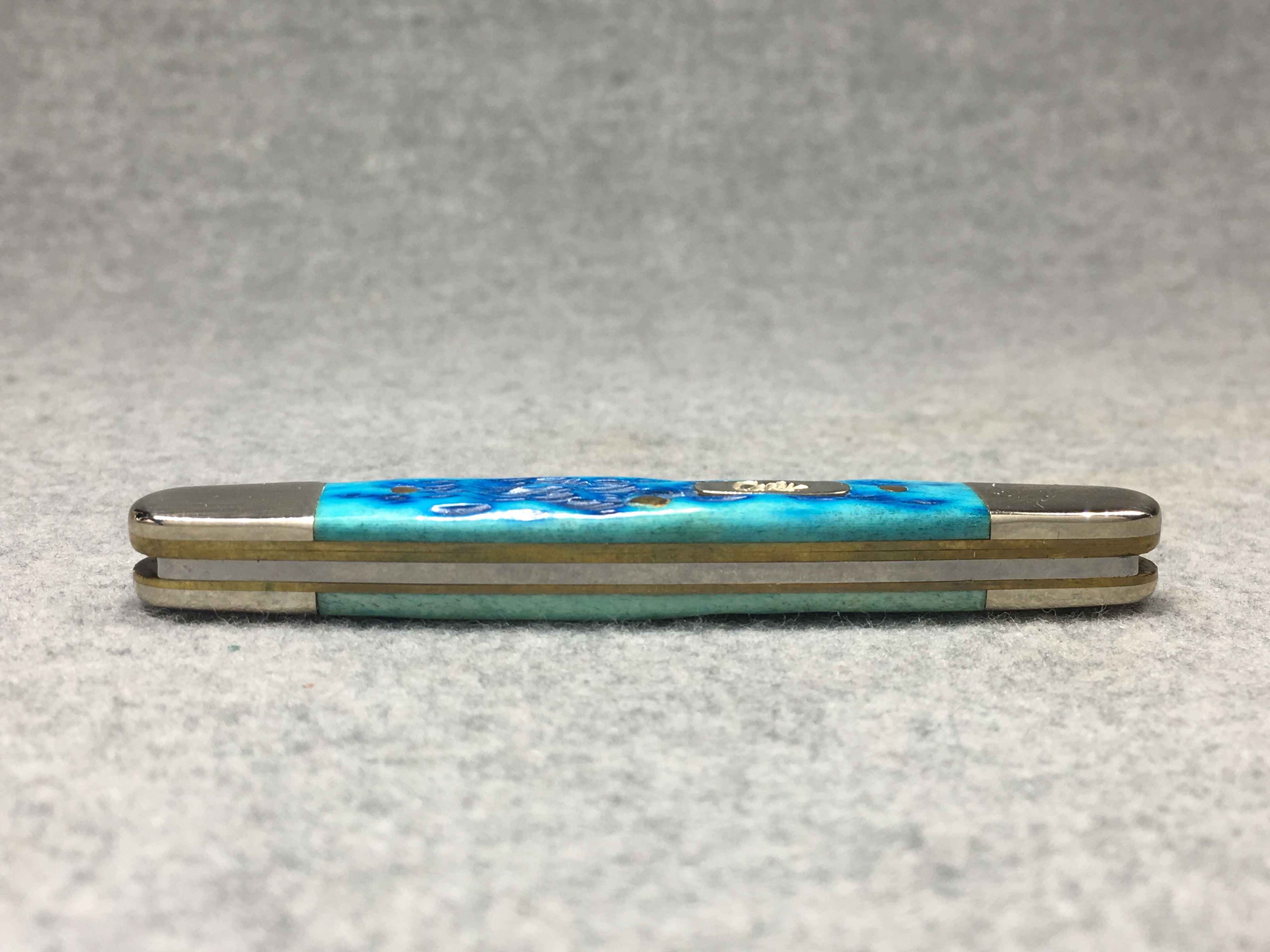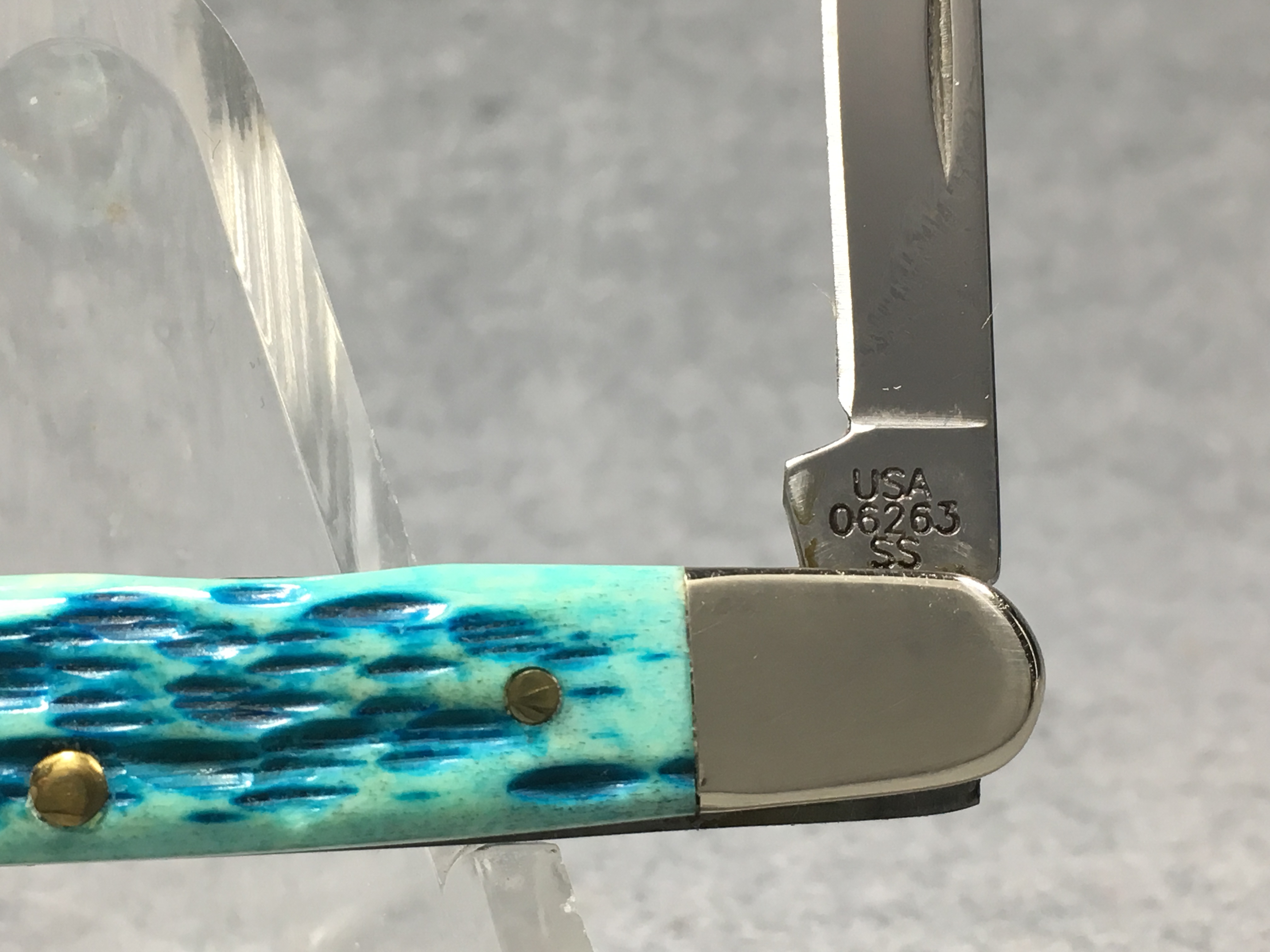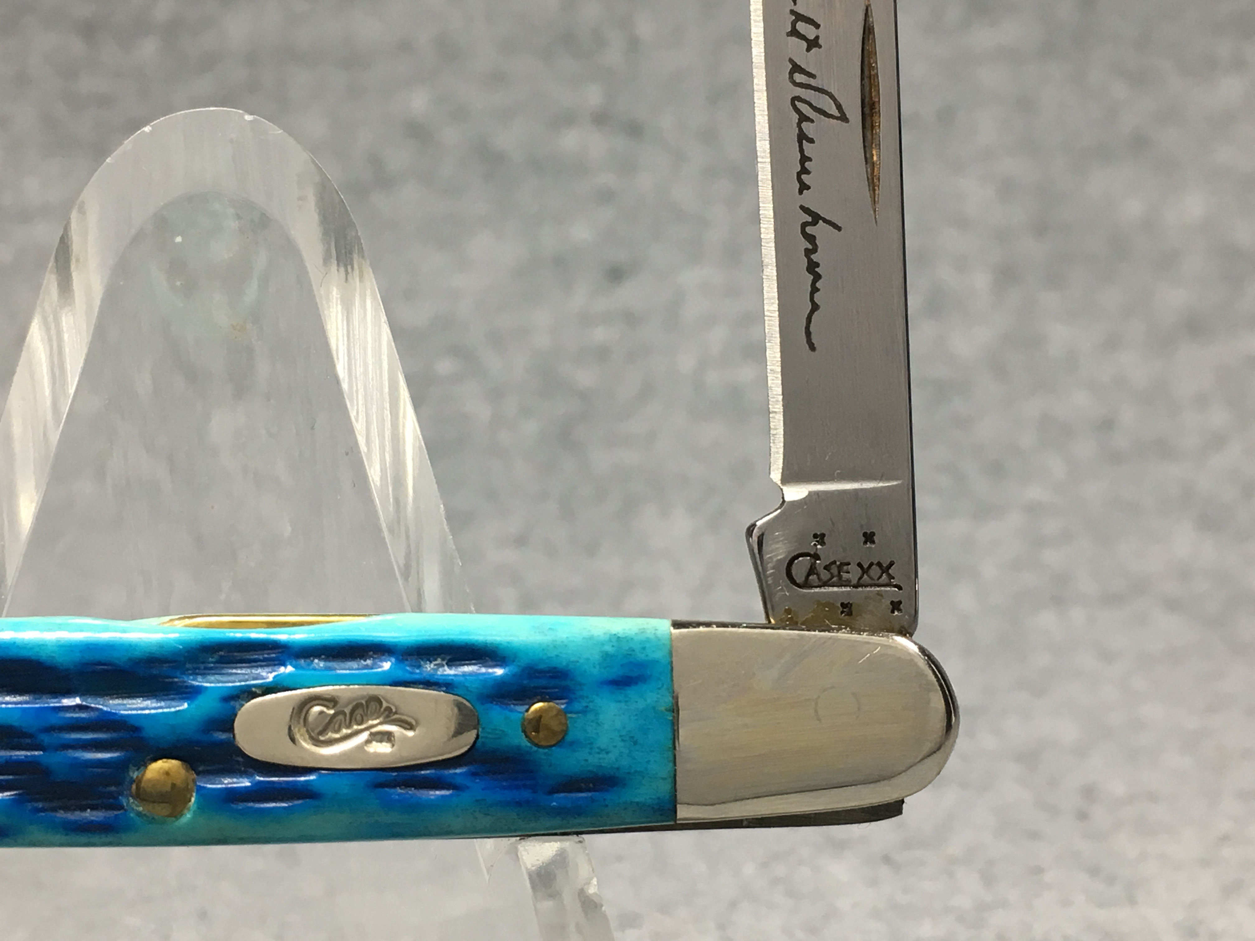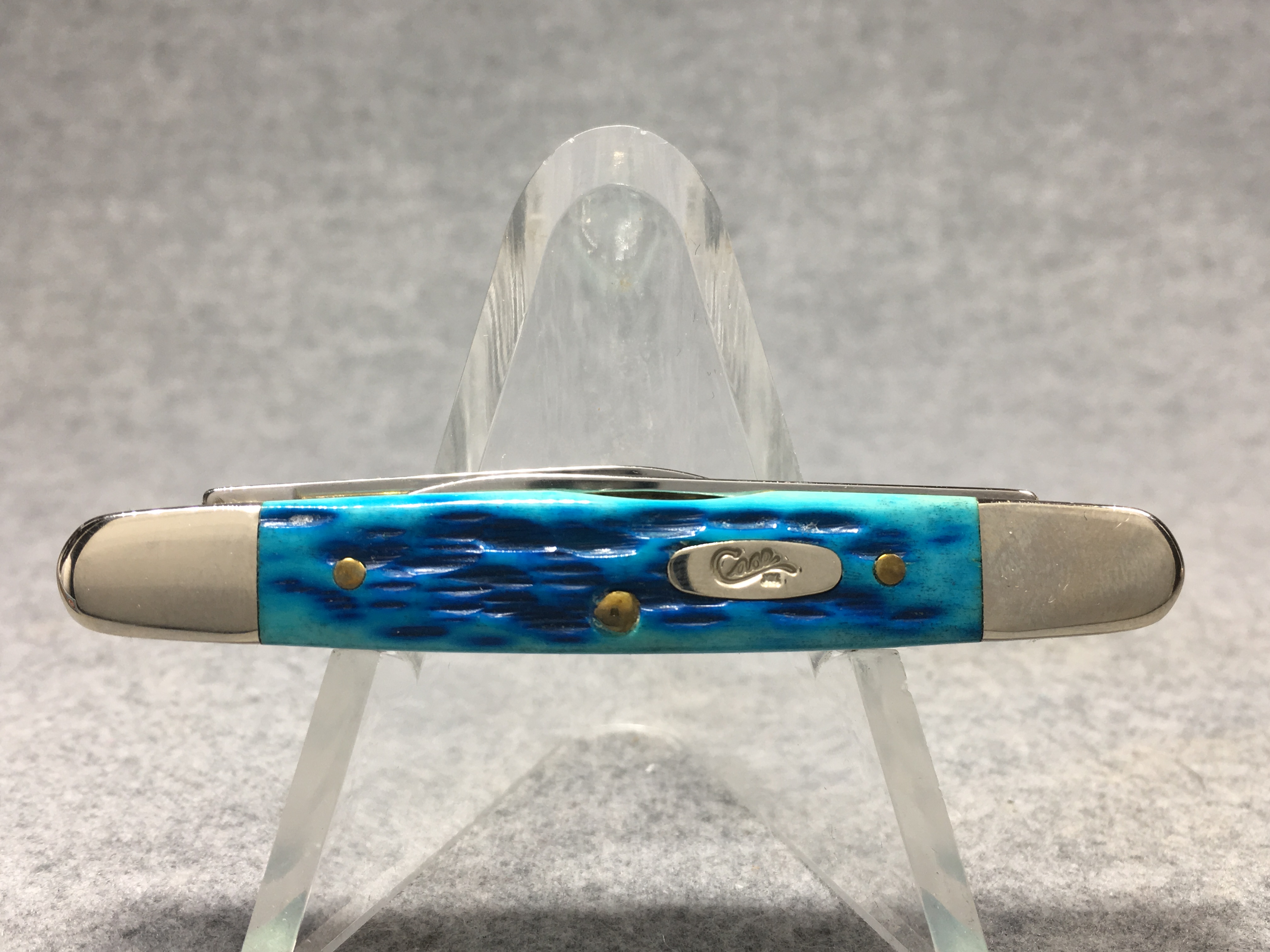 April 05, 2026 - 3-1/8 inches closed. 4-7/8 inches open. Made in USA. "CASE XX  x x " and "USA 06263 SS" tang stamps. Oval long-C script "Case xx" shield. Stainless Steel blades. Master blade etched with Dwight Eisenhower's signature. Caribbean blue jigged bone handle. Nickel Silver bolsters. Brass liner.