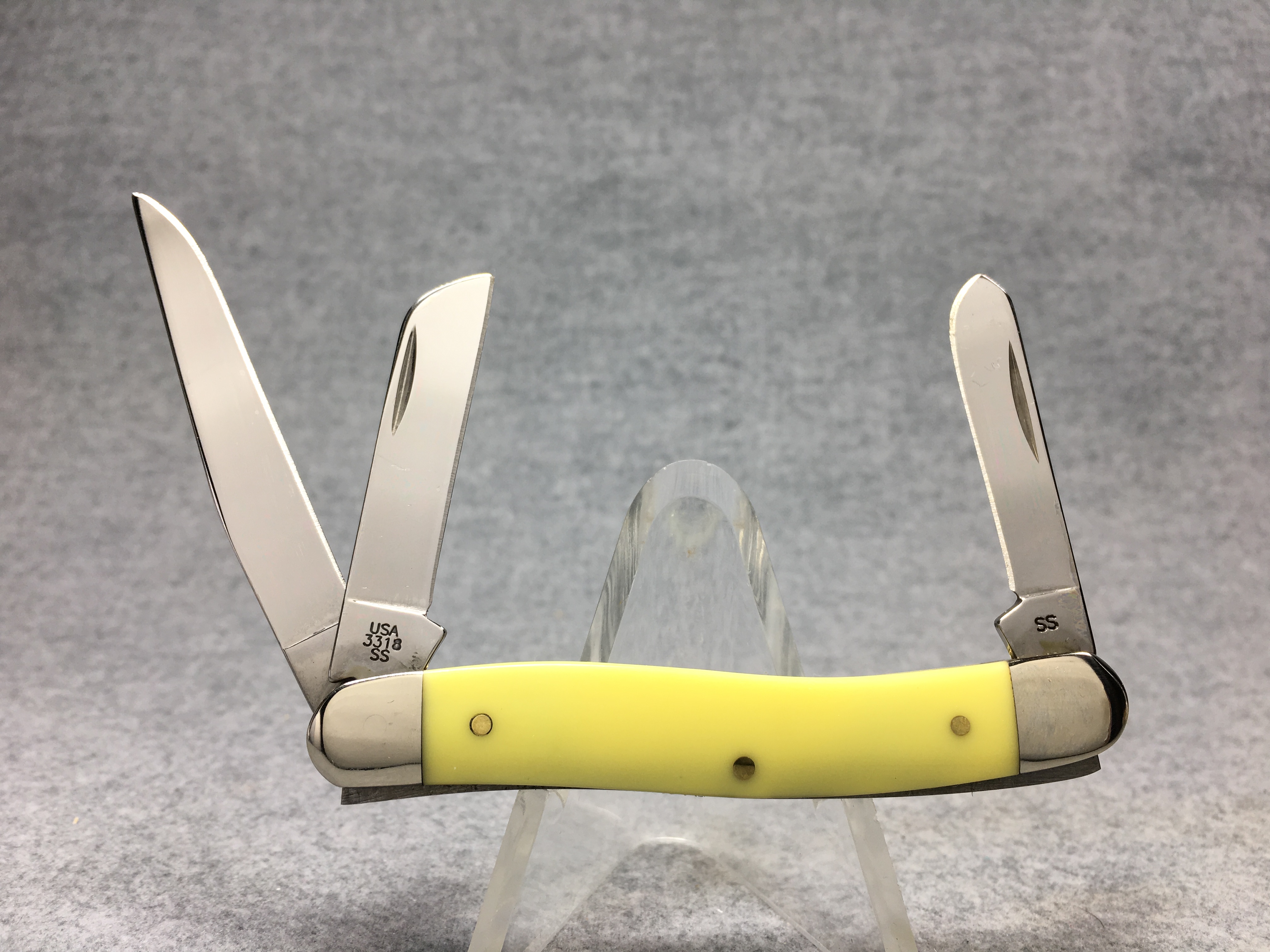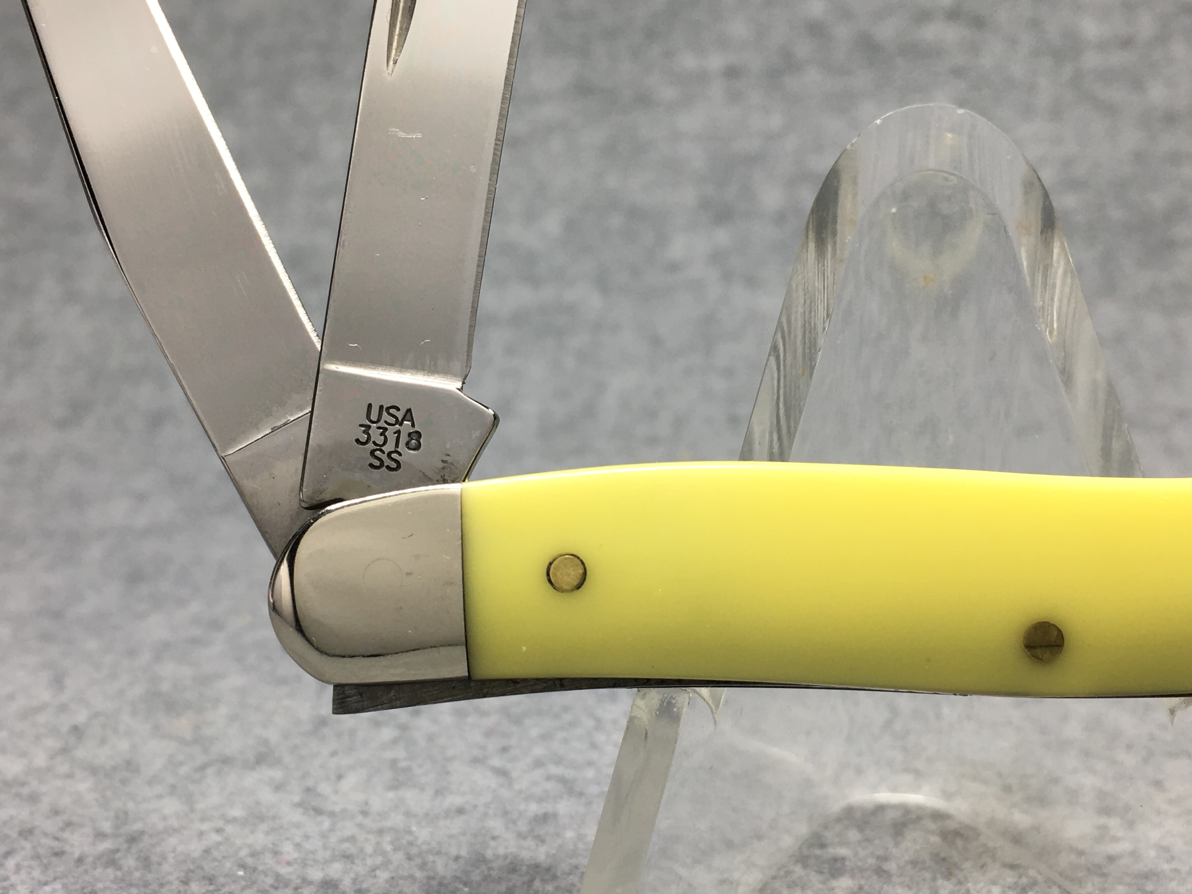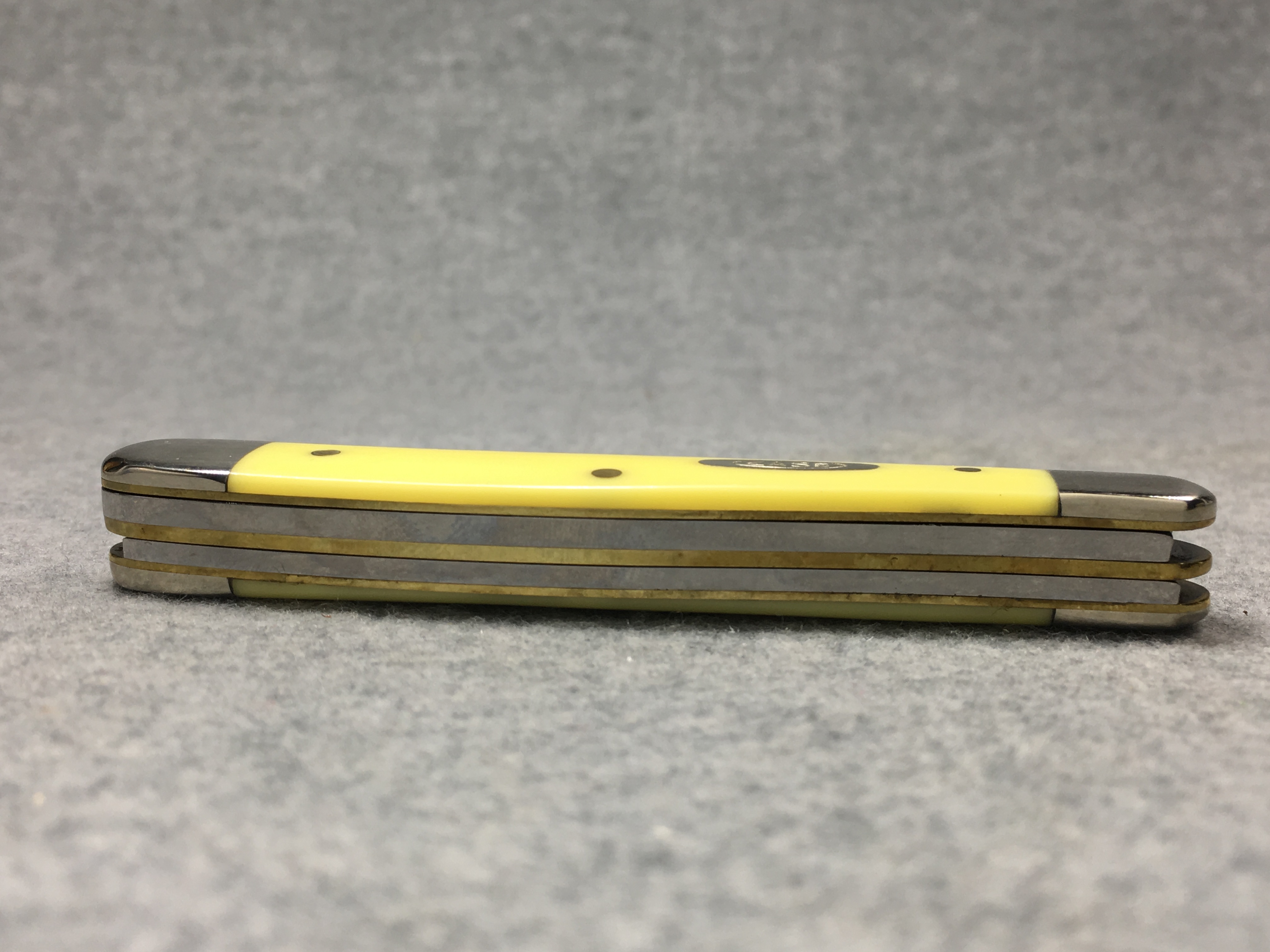 October 26, 2025 - 2-5/8 inches closed. 6-1/8 inches open. Made in USA. "  x x*x  CASE XX  *x*x*  " (with lightning bolt S), "SS", and "USA 3318 SS" tang stamps. Double oval open-C "CASE" shield. Stainless steel blades. Yellow composition handle. Nickel Silver bolsters. Brass liner.