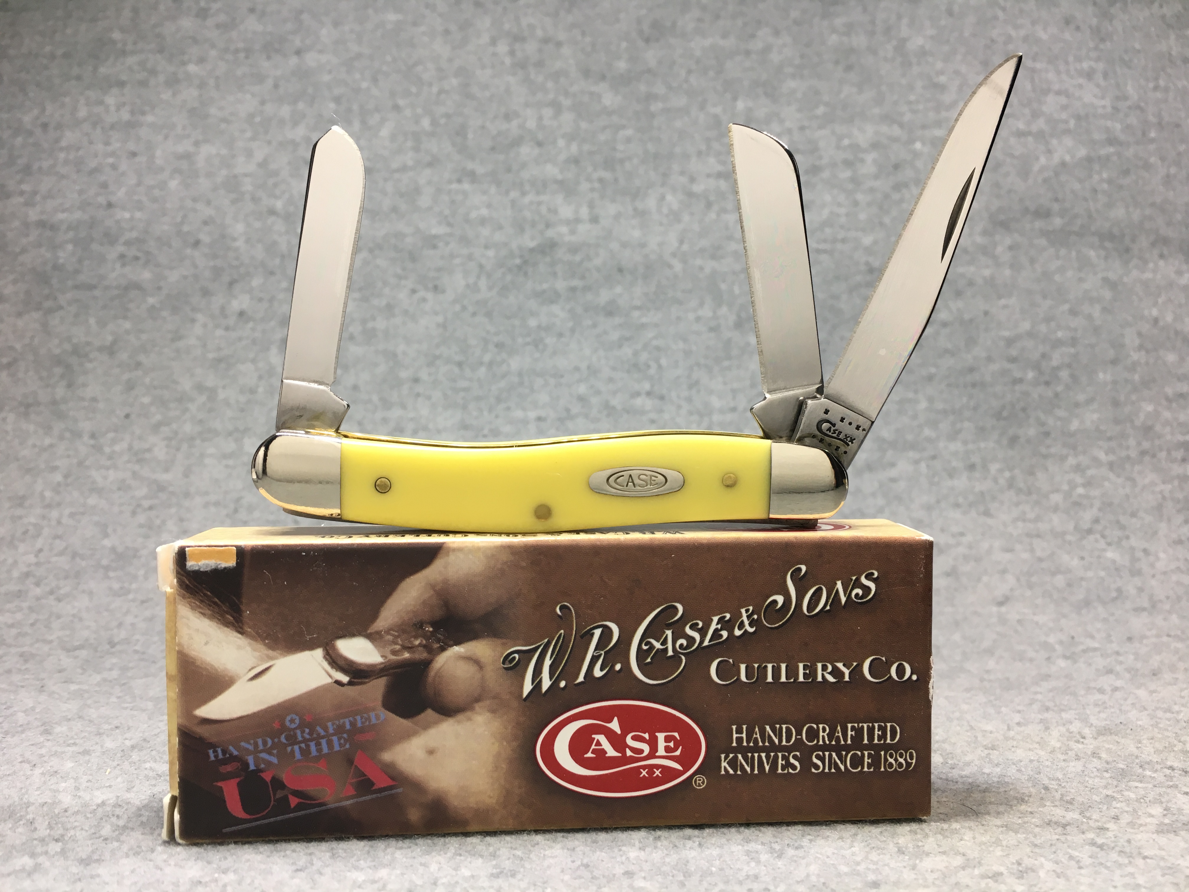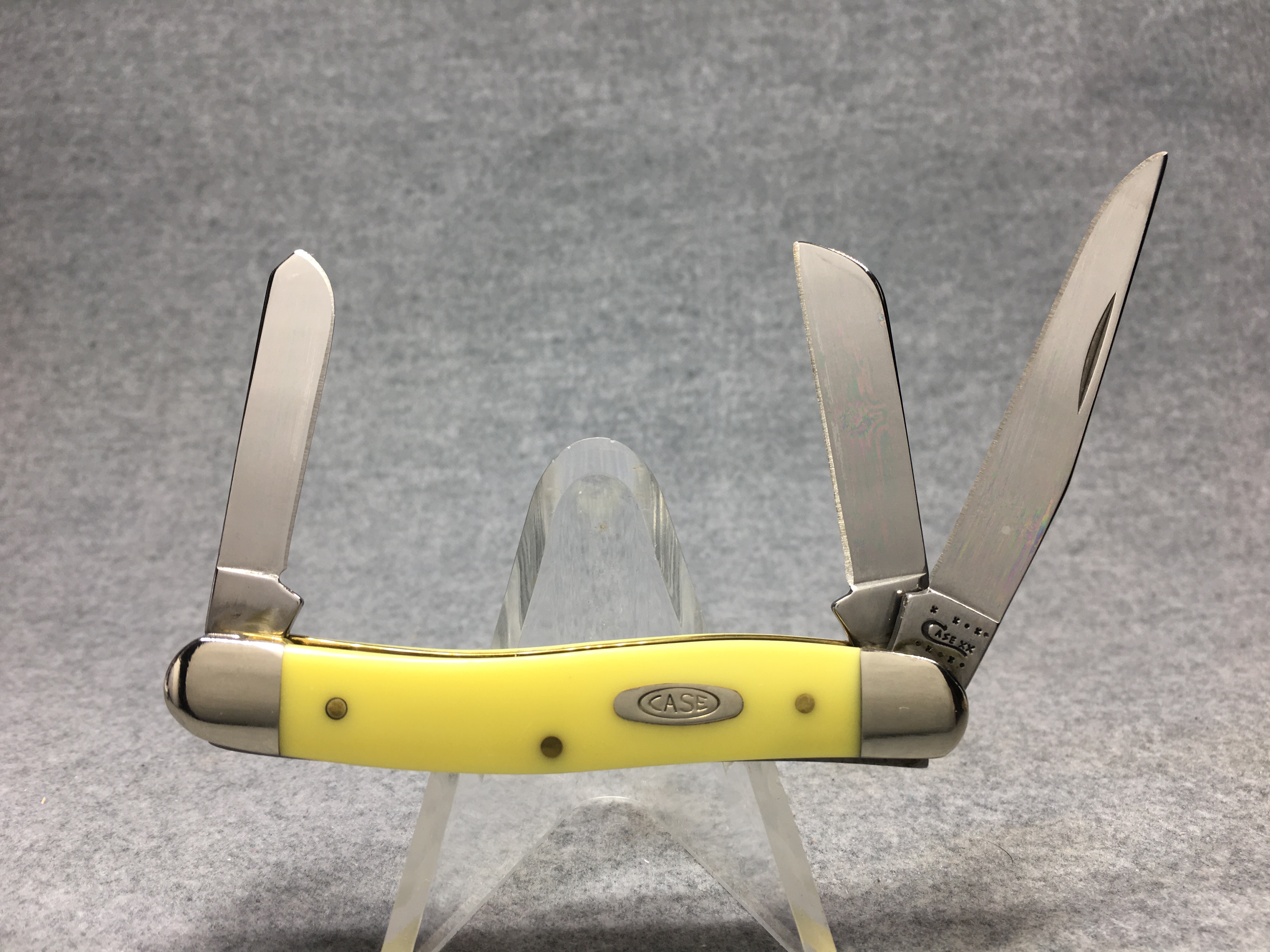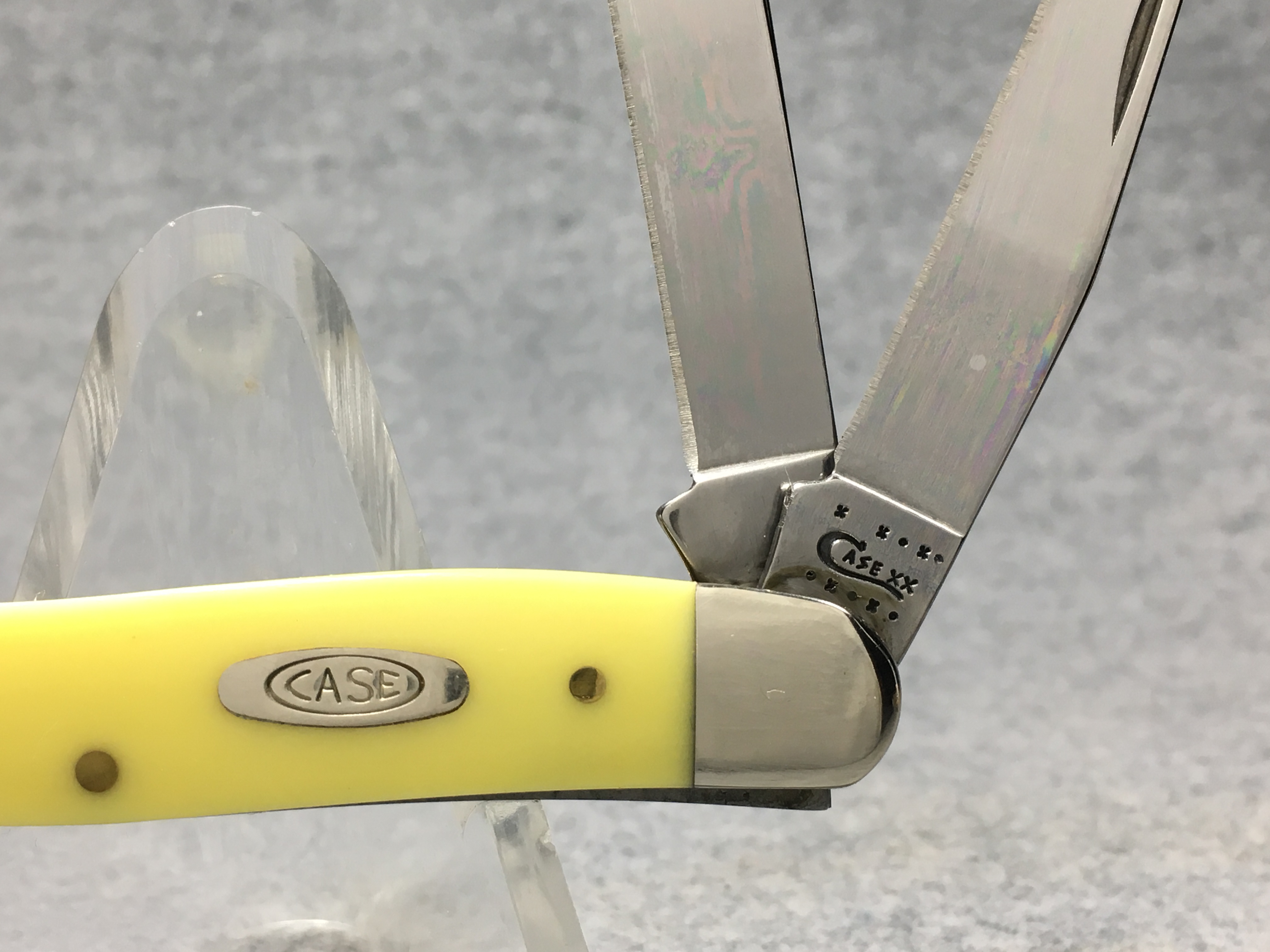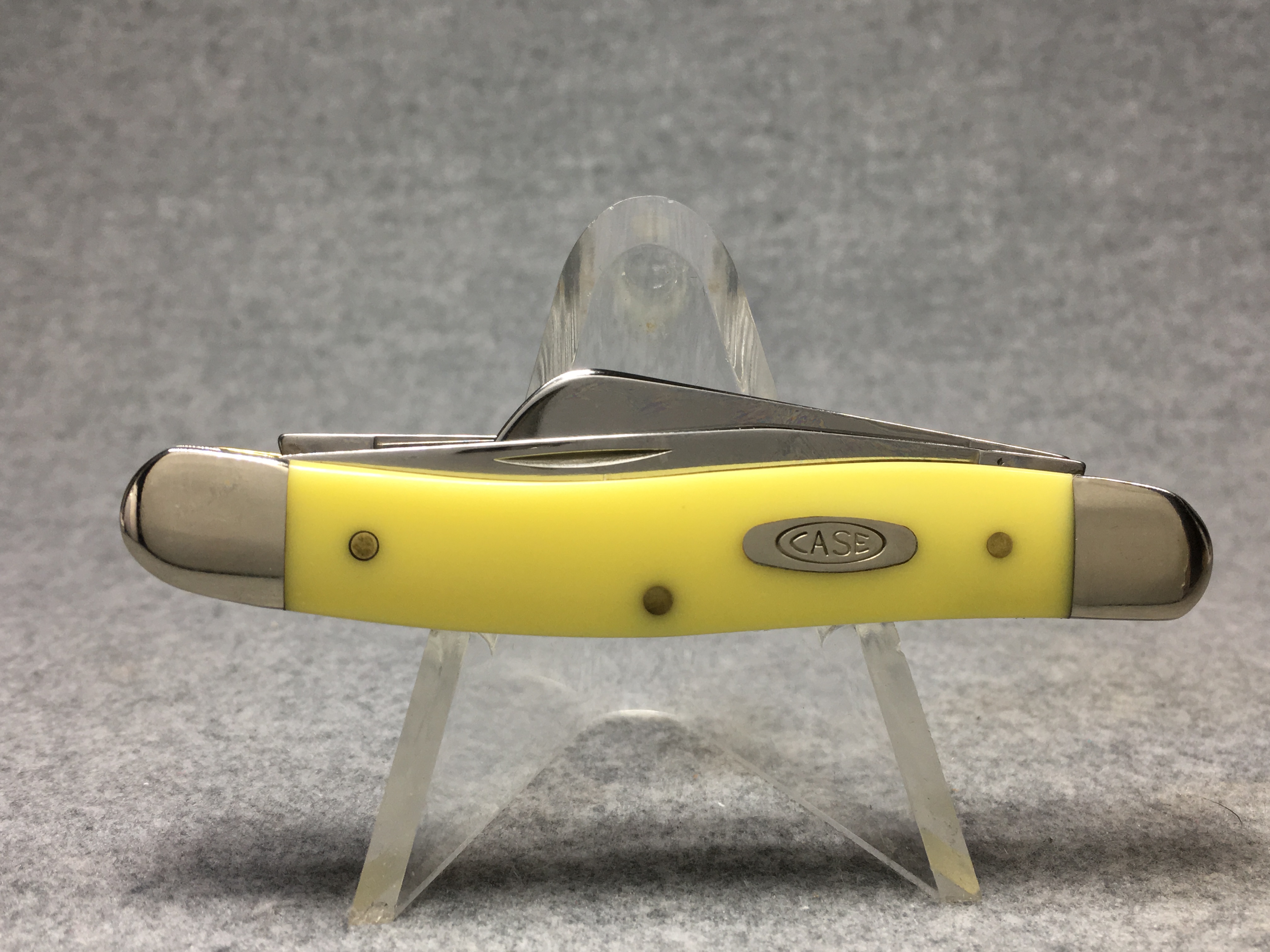 October 26, 2025 - 2-5/8 inches closed. 6-1/8 inches open. Made in USA. "  x x*x  CASE XX  *x*x*  " (with lightning bolt S), "SS", and "USA 3318 SS" tang stamps. Double oval open-C "CASE" shield. Stainless steel blades. Yellow composition handle. Nickel Silver bolsters. Brass liner.