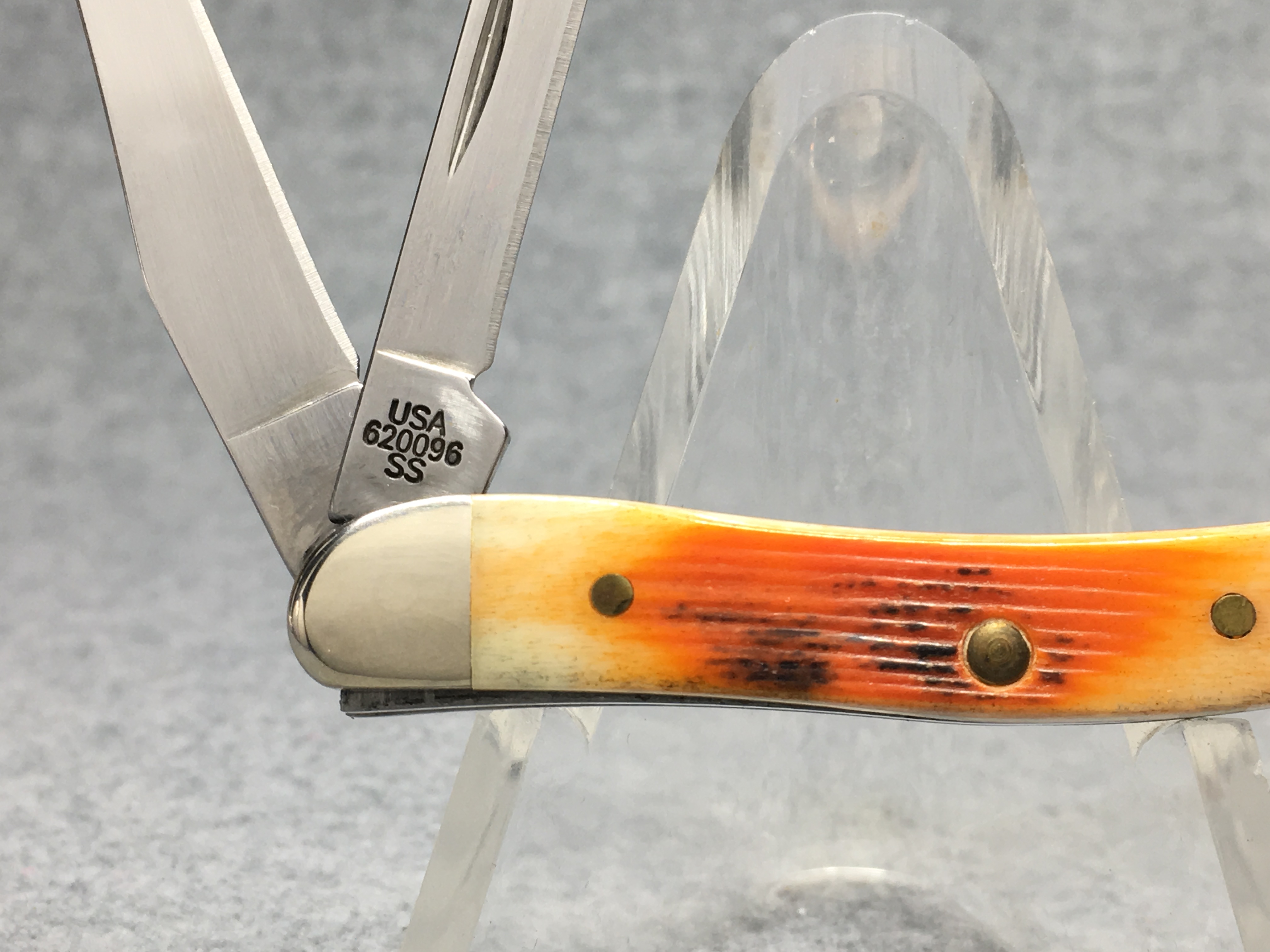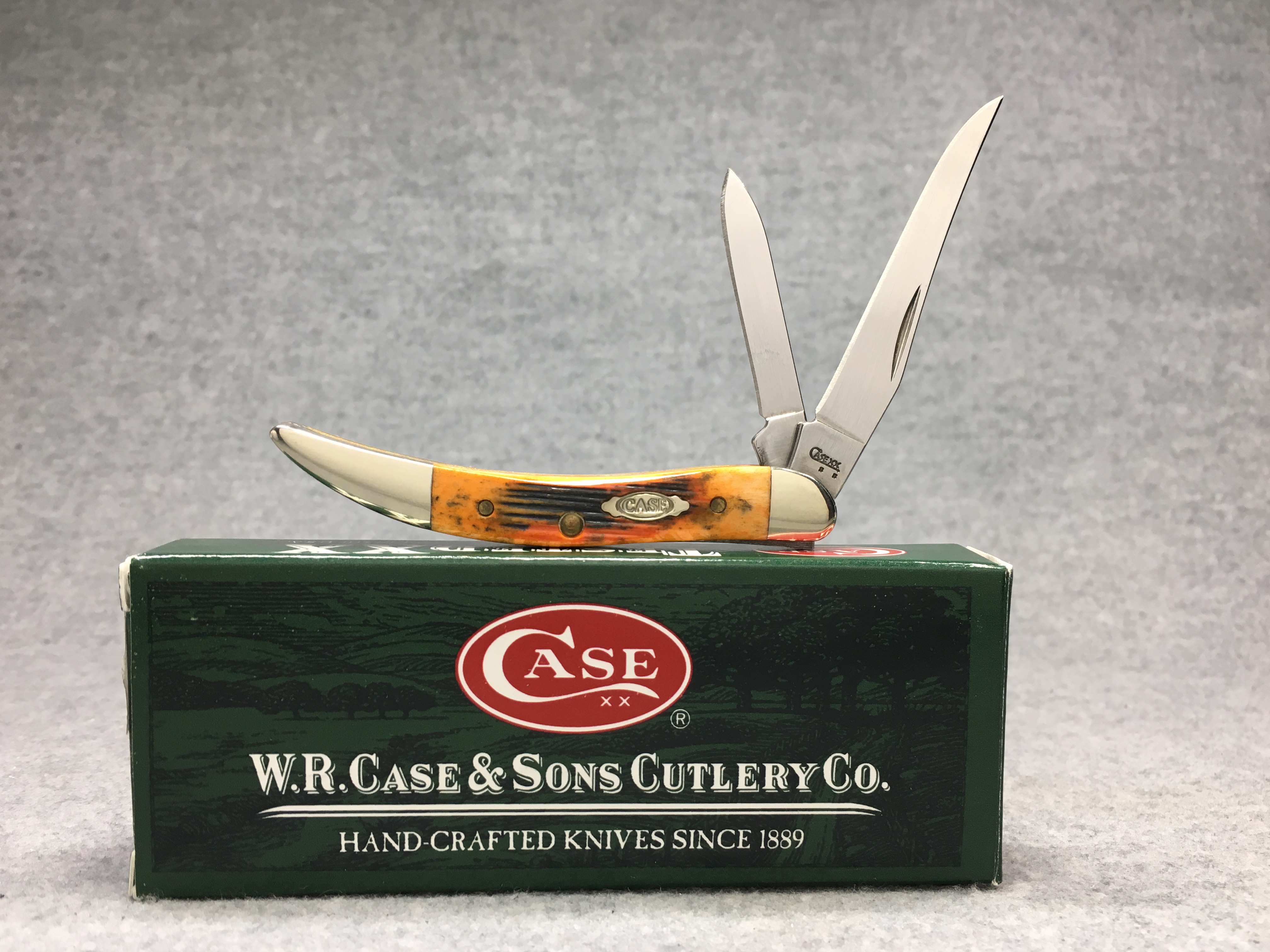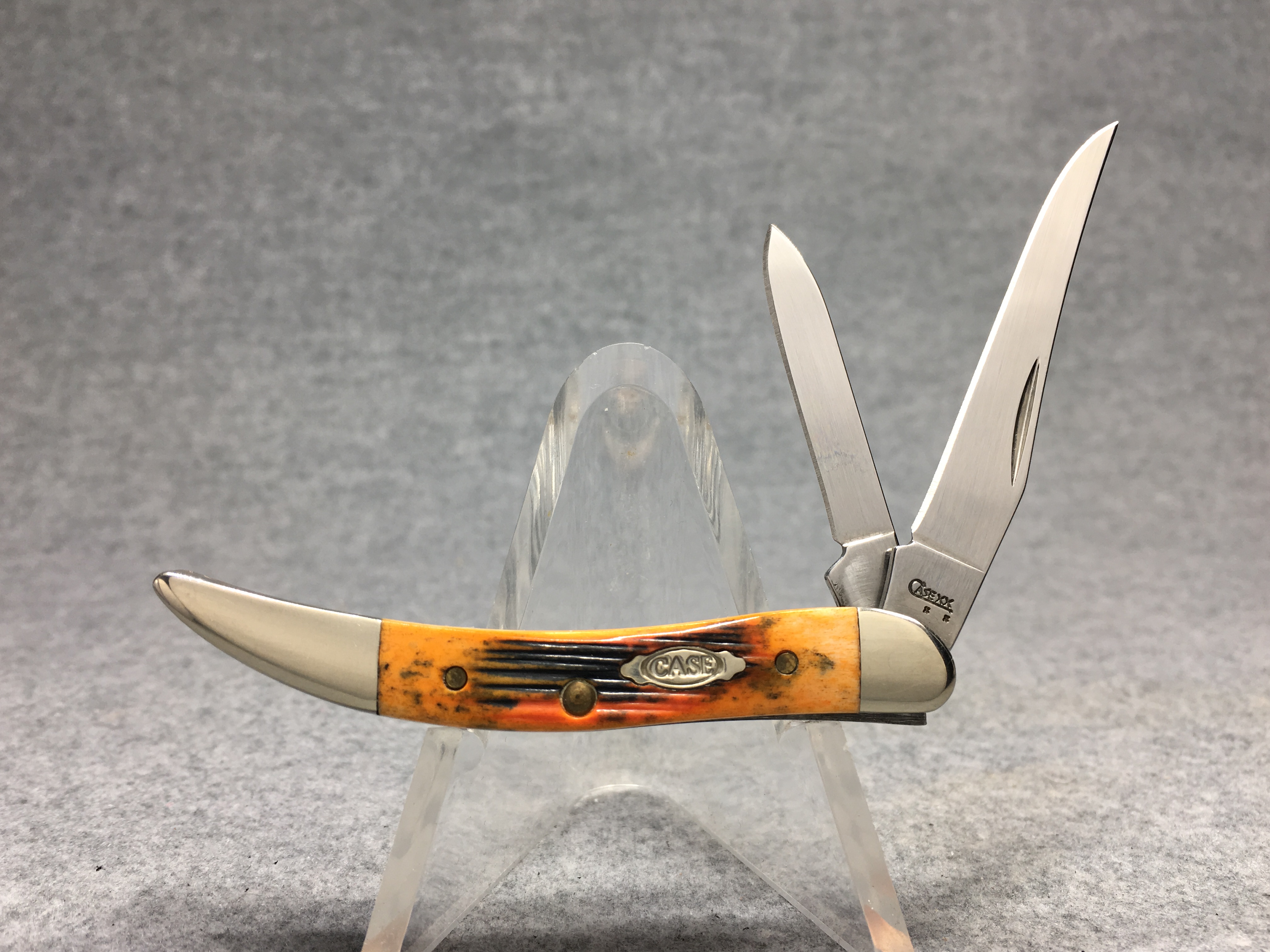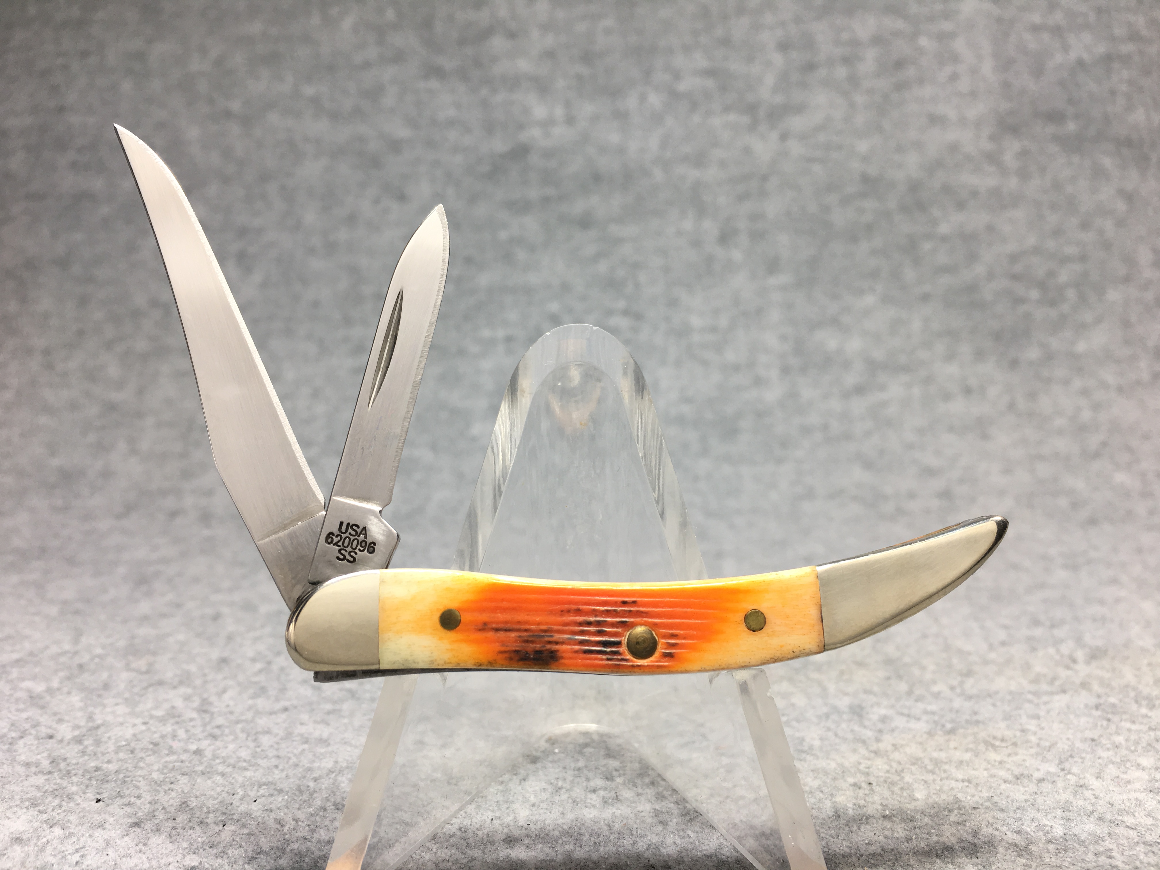 October 26, 2025 - 2-Blade Small Texas Toothpick Knife. 3 inches closed. 5-1/4 inches open. Made in USA. "          CASE XX    x x  " (with lightning bolt S) and "USA 620096 SS" tang stamps. Double oval closed-C "CASE" shield. Stainless steel blades. Autumn Jigged Bone handle. Nickel Silver bolsters. Brass liner. With original box and paperwork.