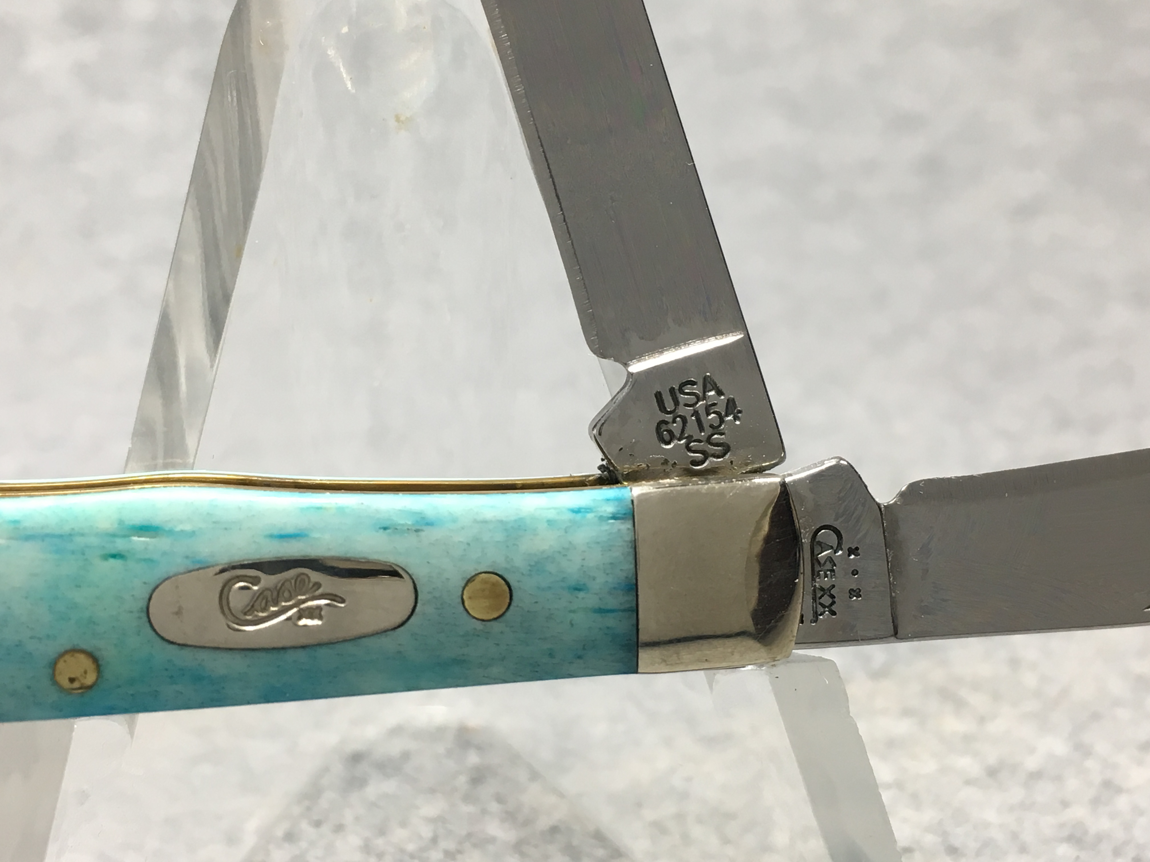 December 25, 2025 - 2-1/2 inches closed. 4-3/8 inches open. Made in USA. " x*x  CASE XX  x x x   " (with lightning bolt S) and "USA 62154 SS" tang stamps. Stainless Steel blades. Caribbean blue smooth bone handle. Oval long-C script "Case XX" shield. Nickel silver bolsters. Brass liner.