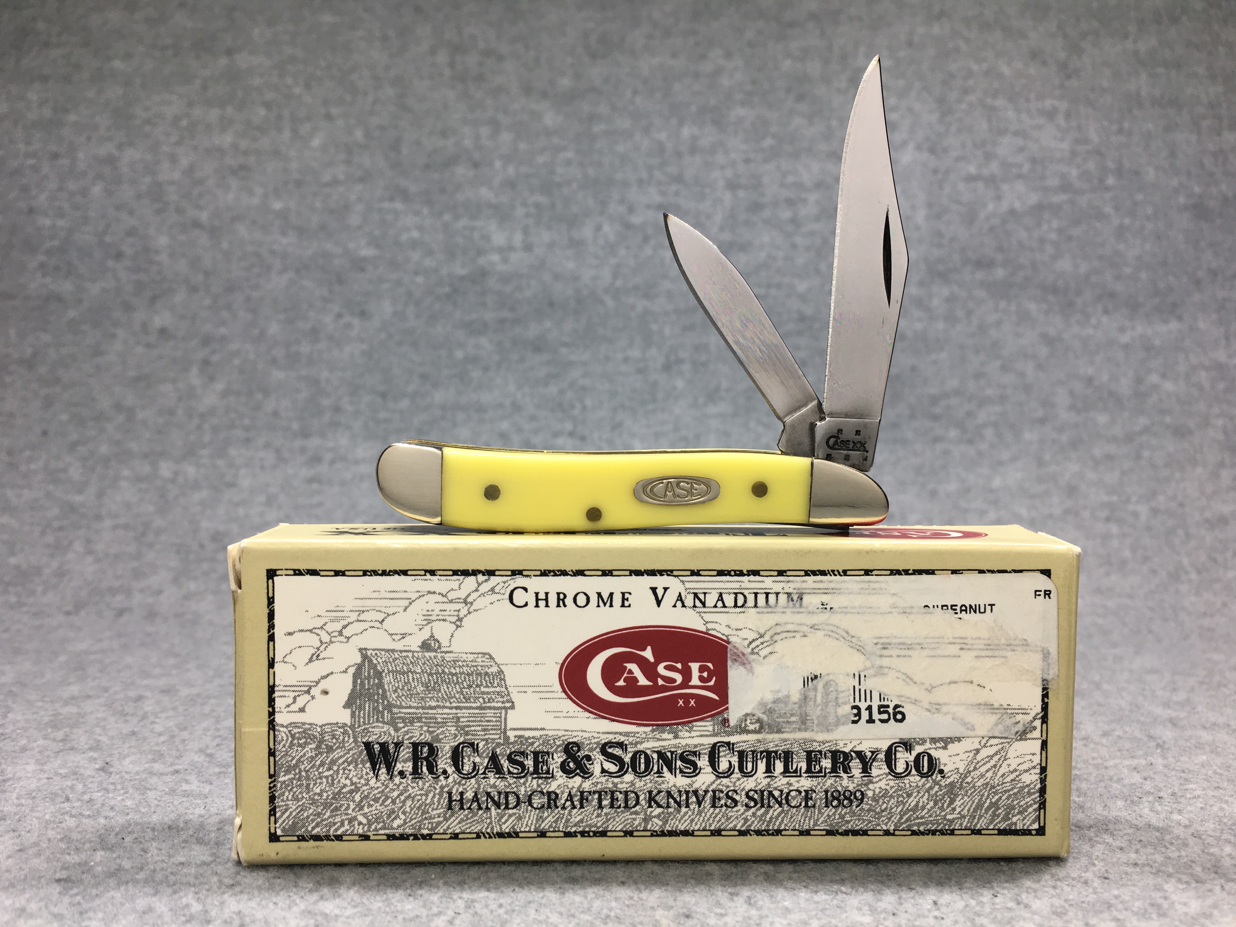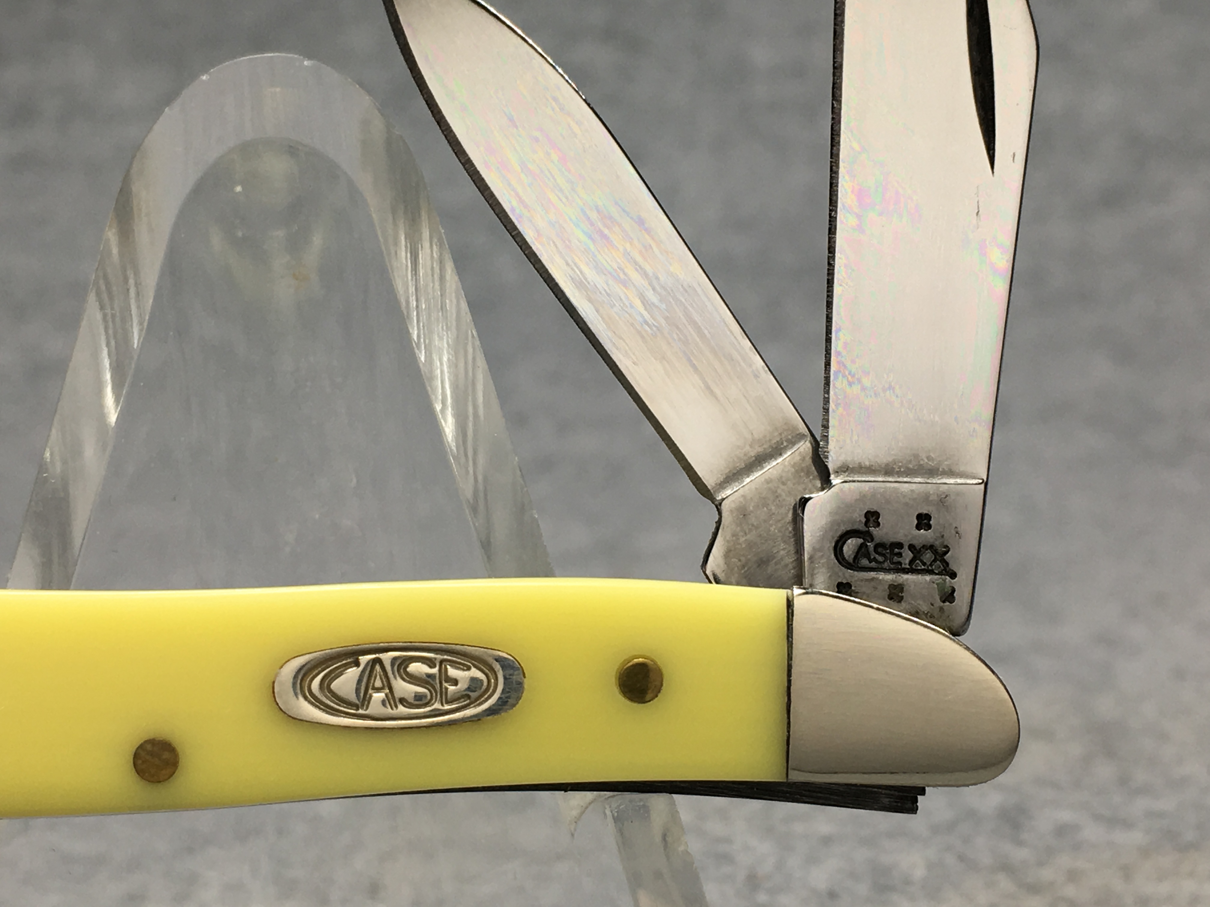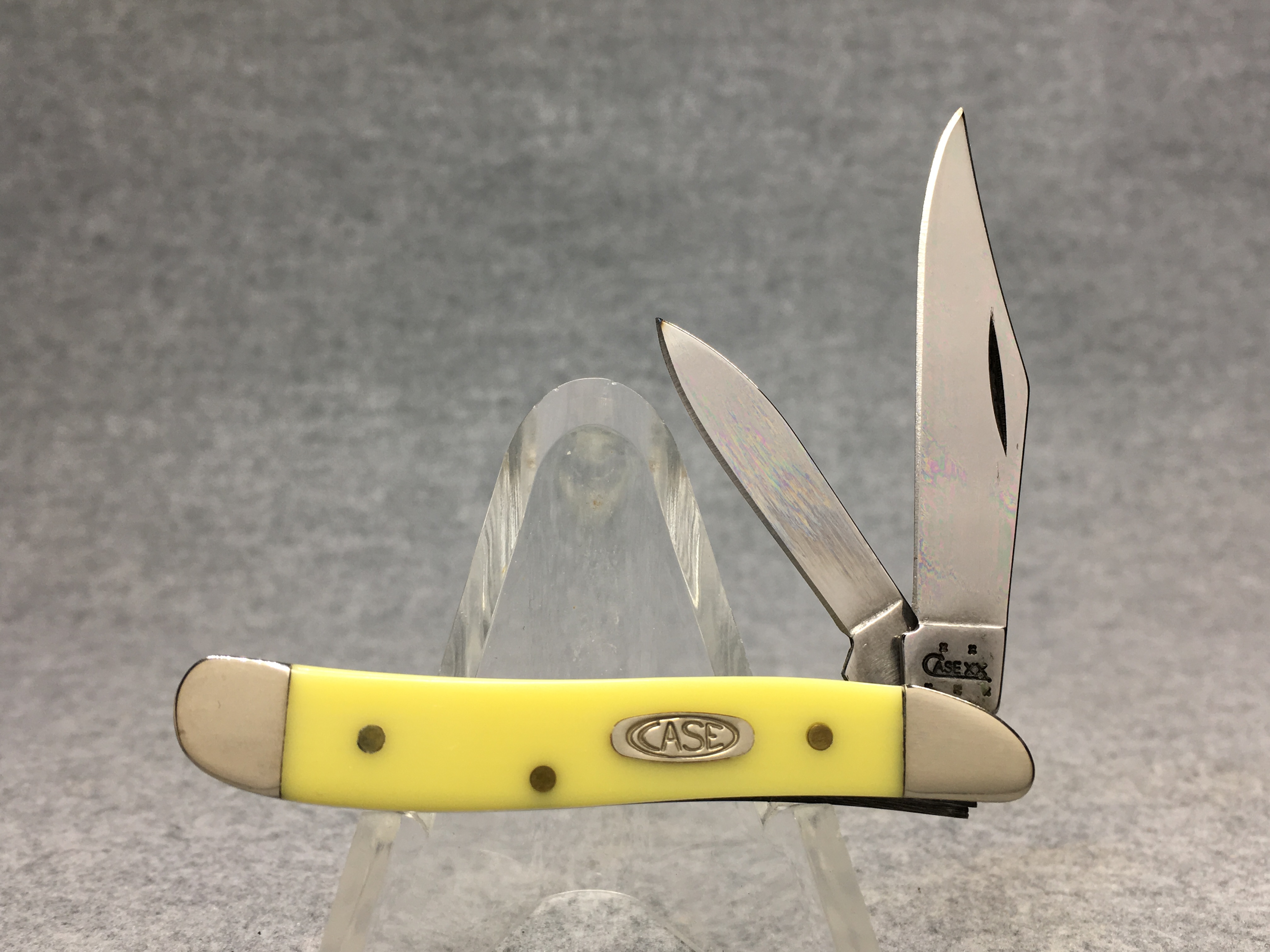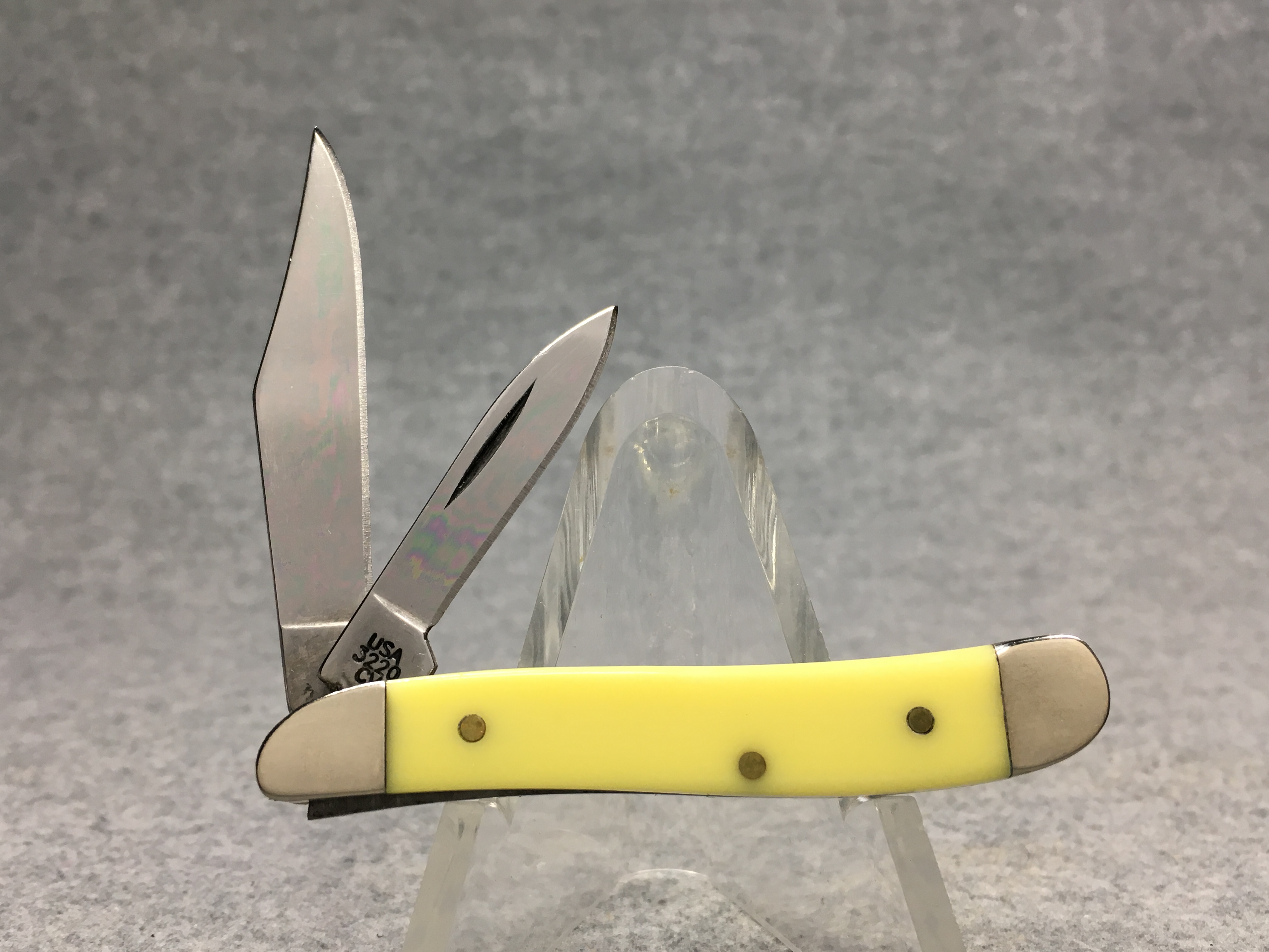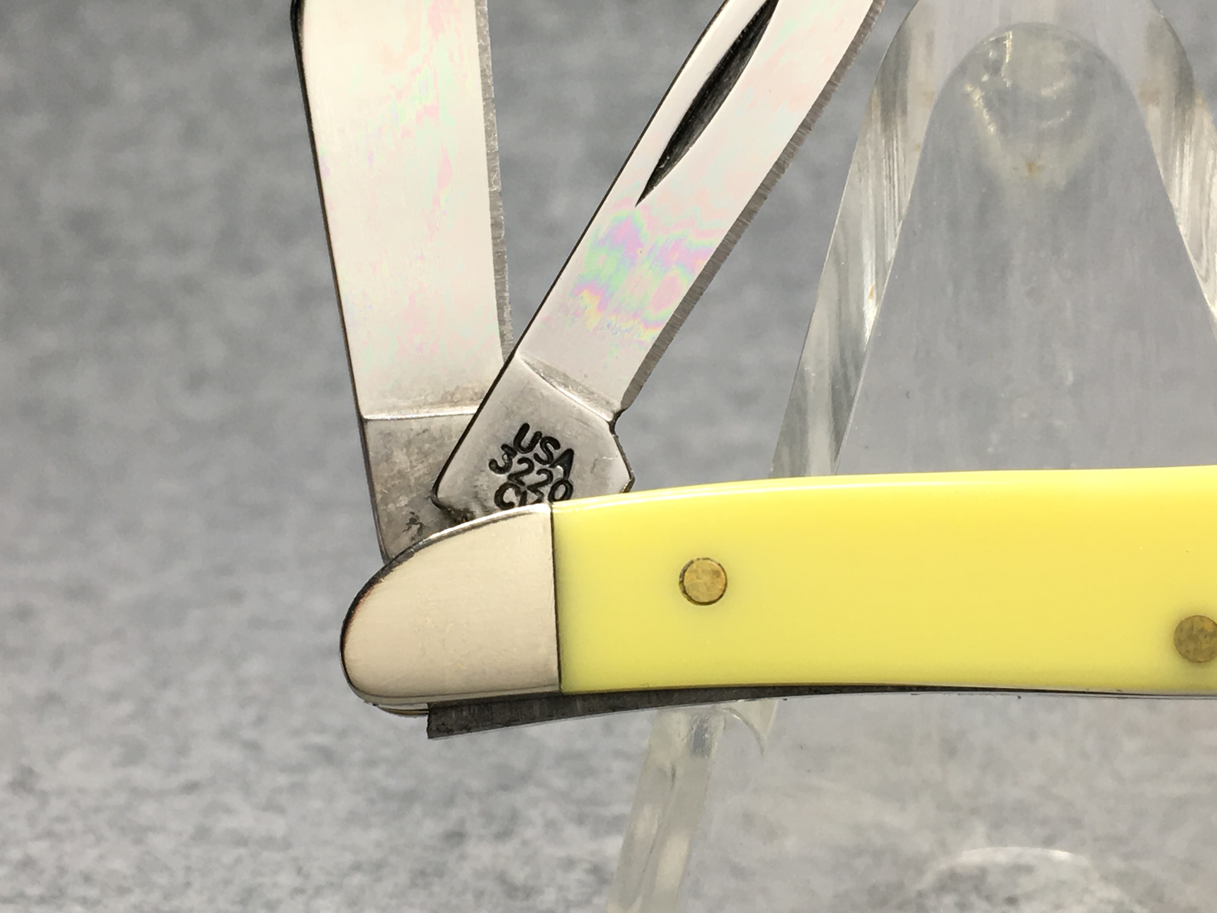 March 15, 2026 - 2-3/4 inches closed. 5 inches open. Made in USA. "  x x  CASE XX   x x x  " (3 dot with regular S) and "USA 3220 CV" tang stamps. Double oval 'Open C' CASE shield. Chrome vanadium blades. Yellow composition handle. Nickel Silver bolsters. Brass liner.