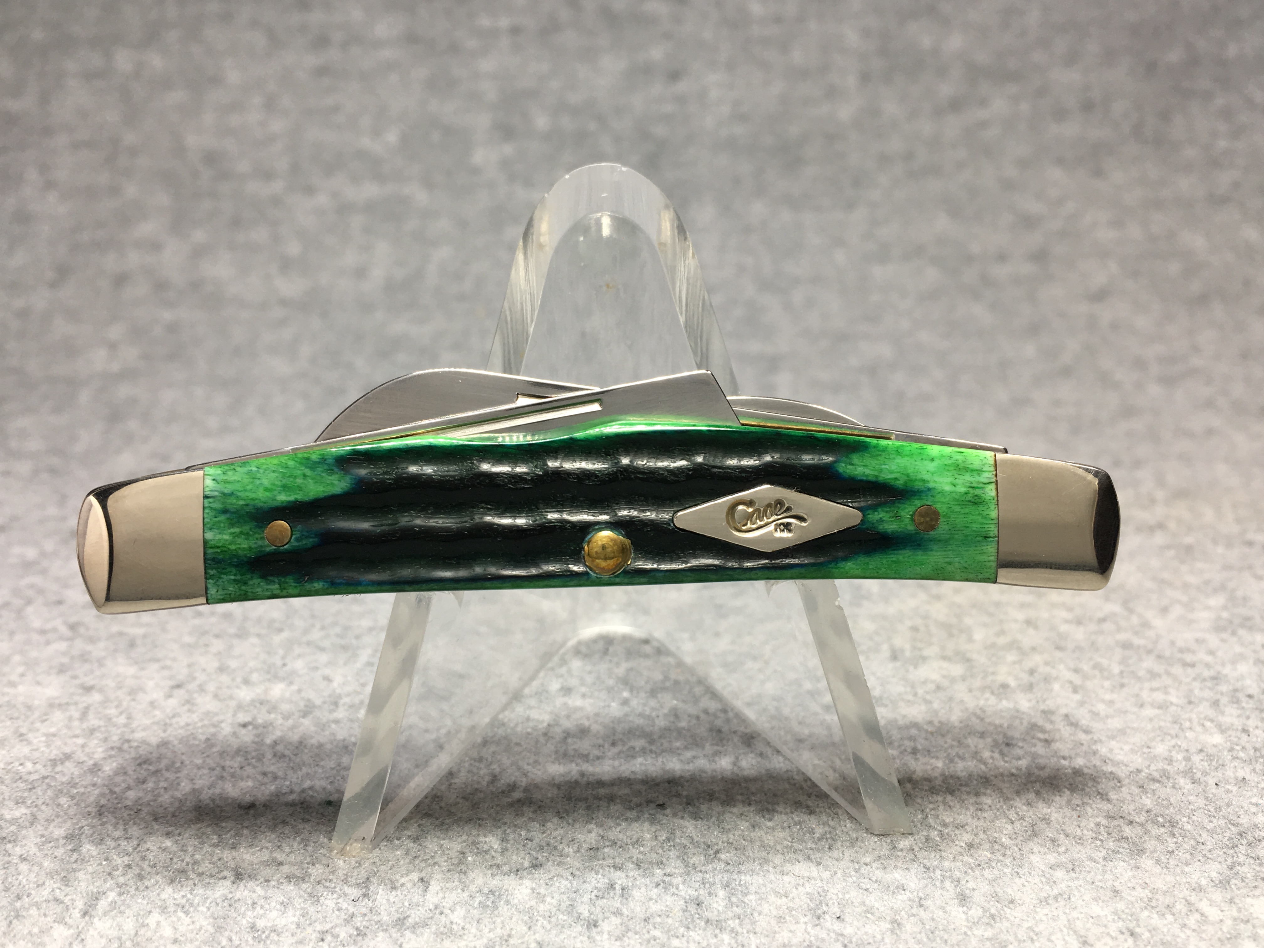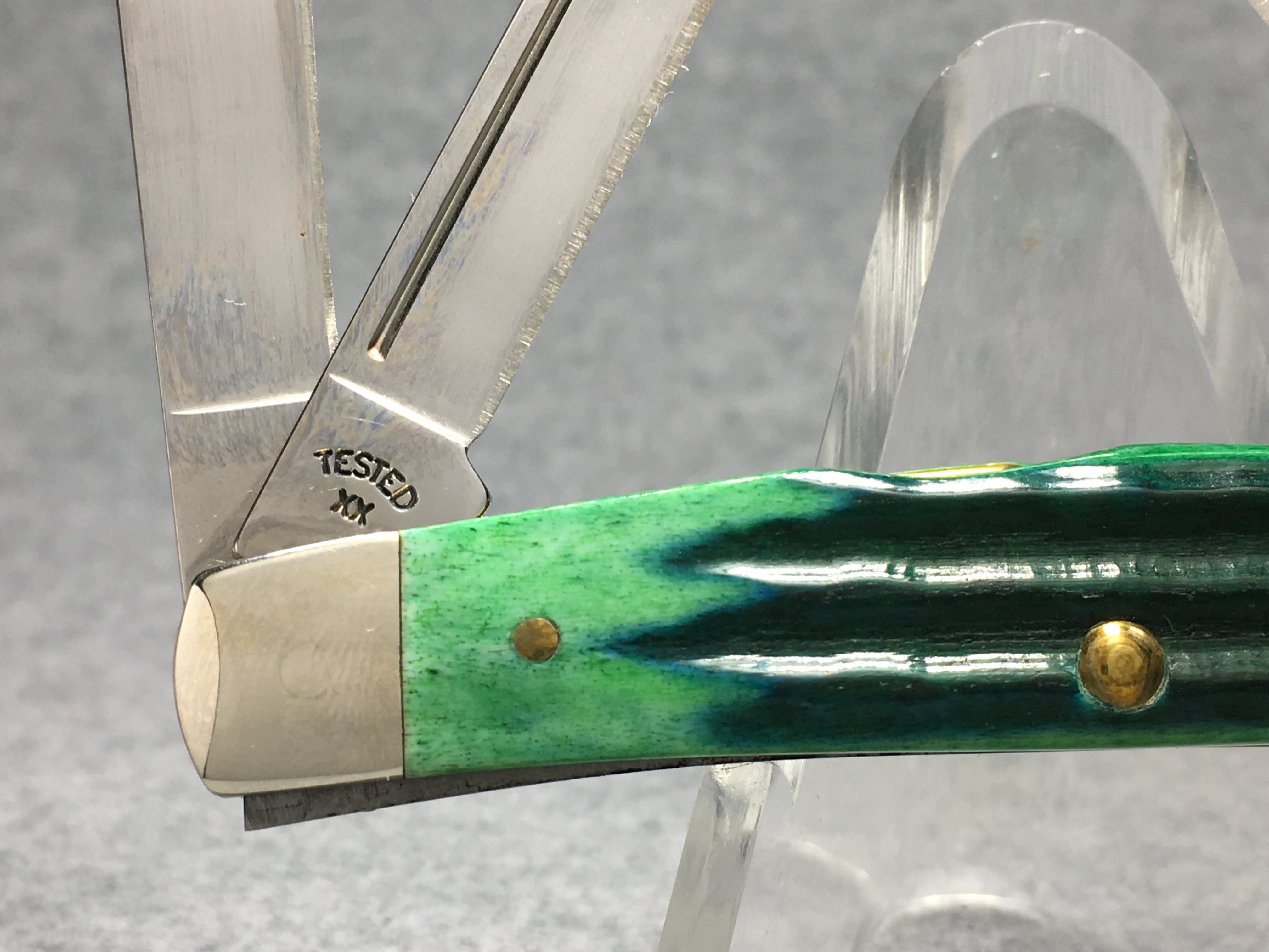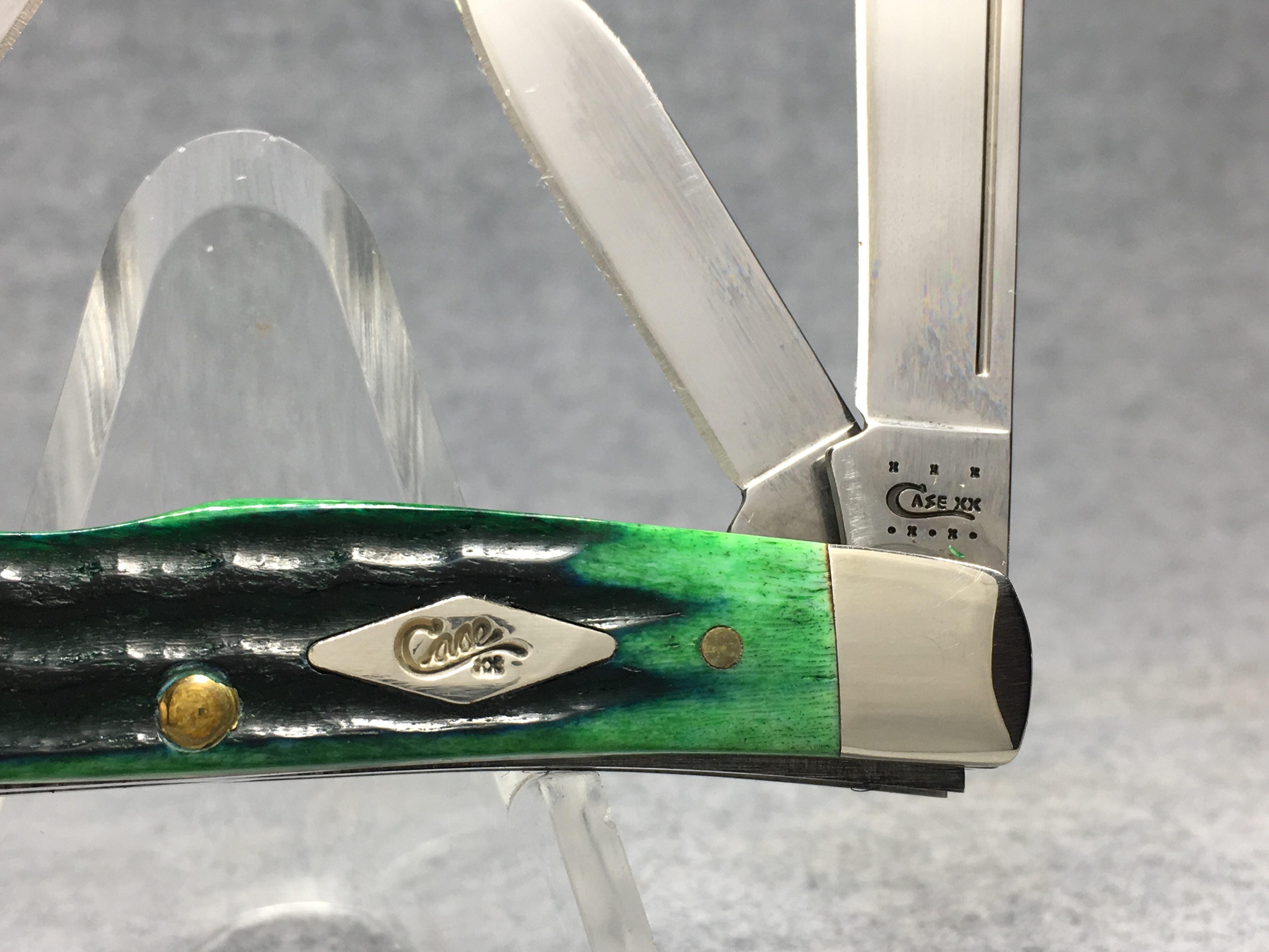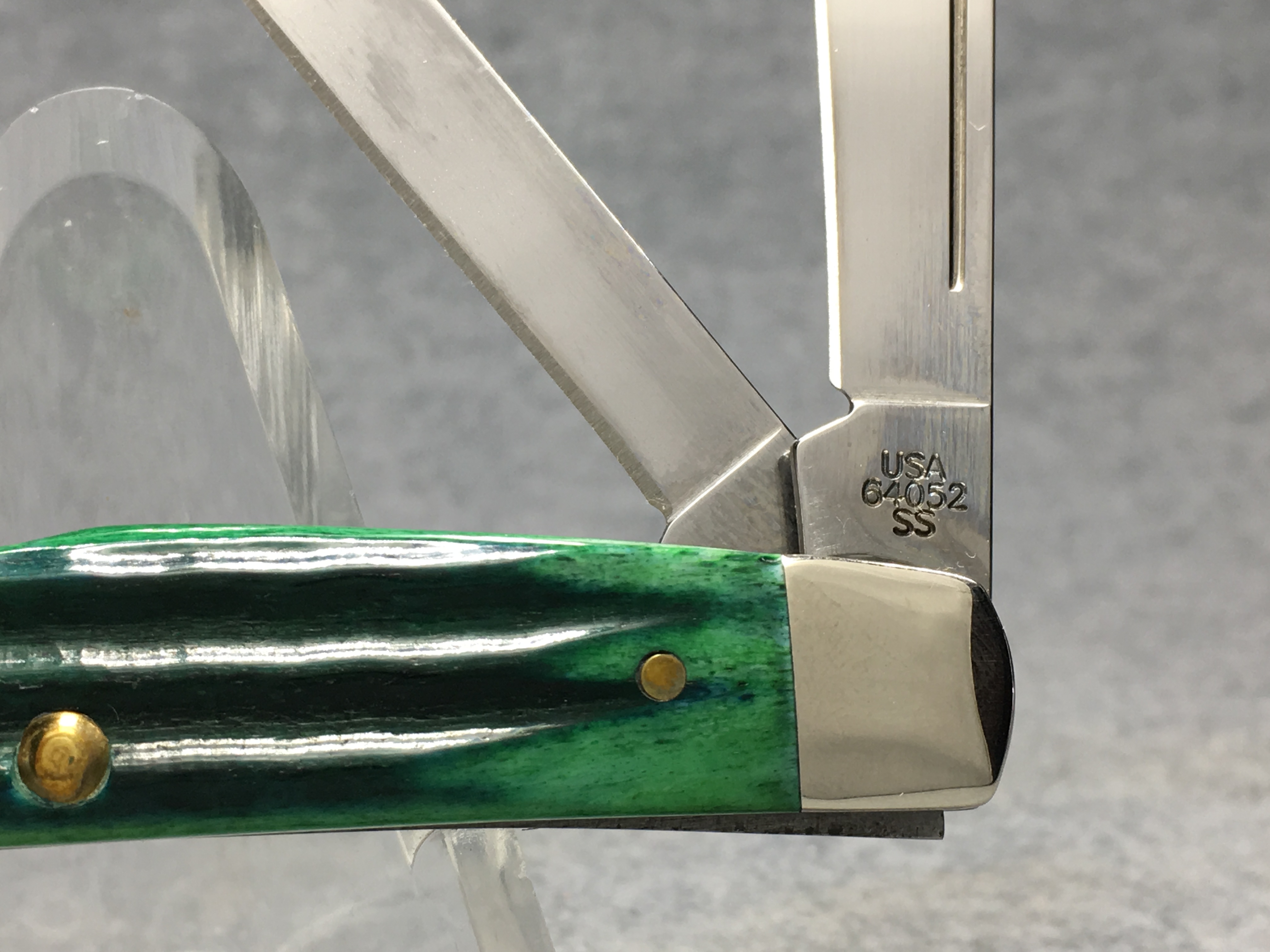 December 24, 2025 - 3-1/2 inches closed. 5-7/8 inches open. Made in USA. "  x x x  Case XX  *x*x*   " (with lightning bolt S), "SS", "TESTED XX", and "USA 64052 SS" tang stamps. Diamond closed-C script "Case xx" shield. Stainless Steel blades. Kentucky Bluegrass green/blue jigged bone handle. Nickel Silver bolsters. Brass liner.
