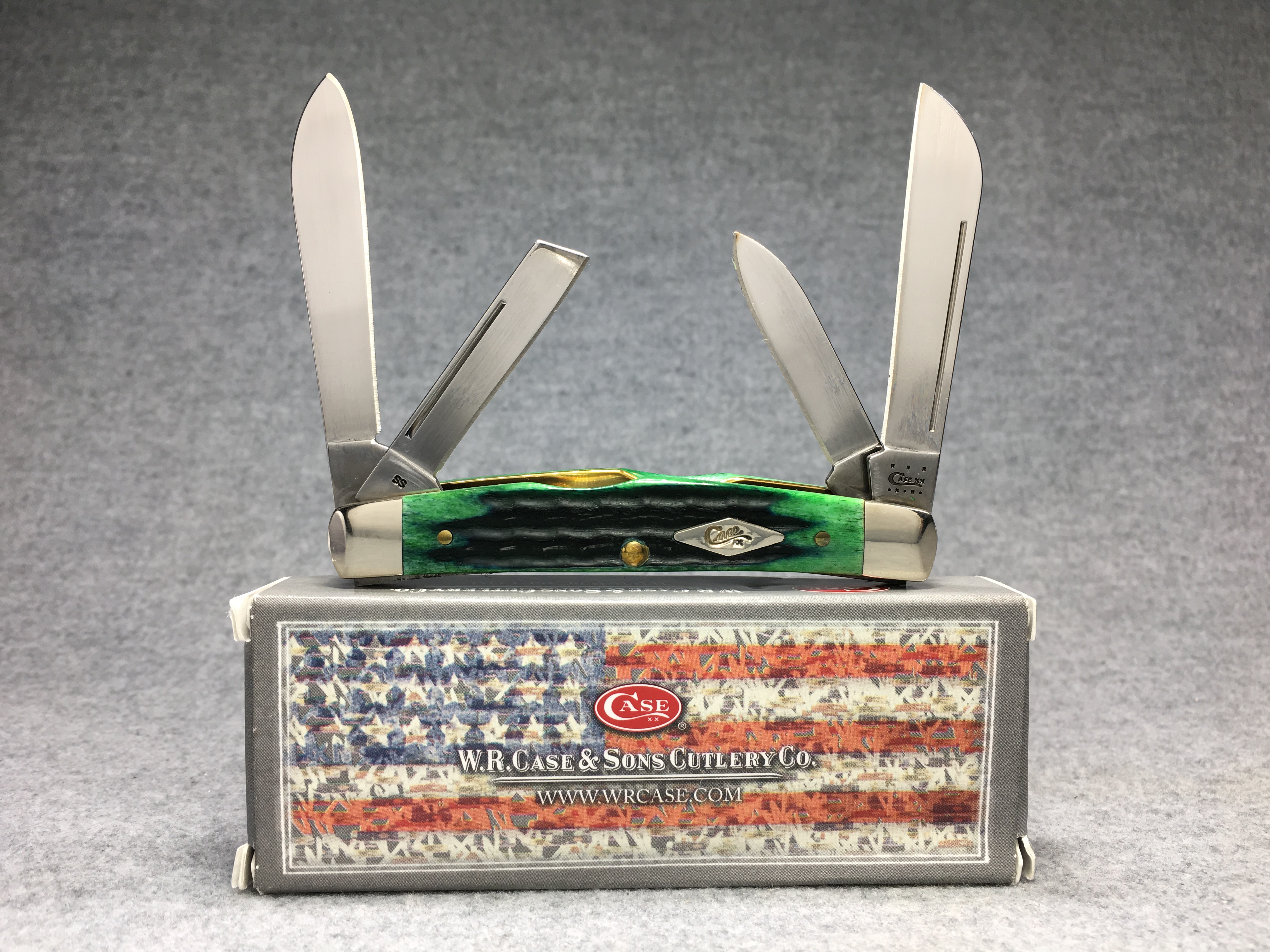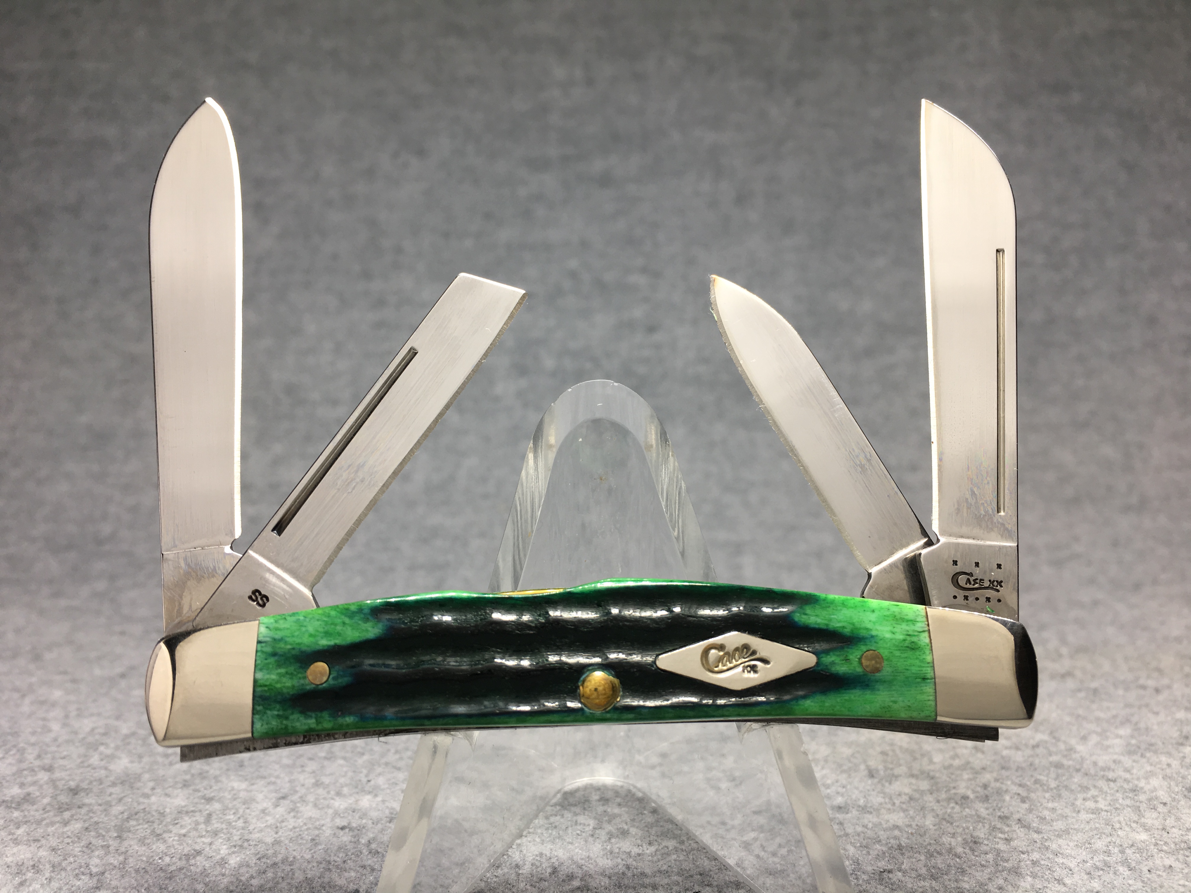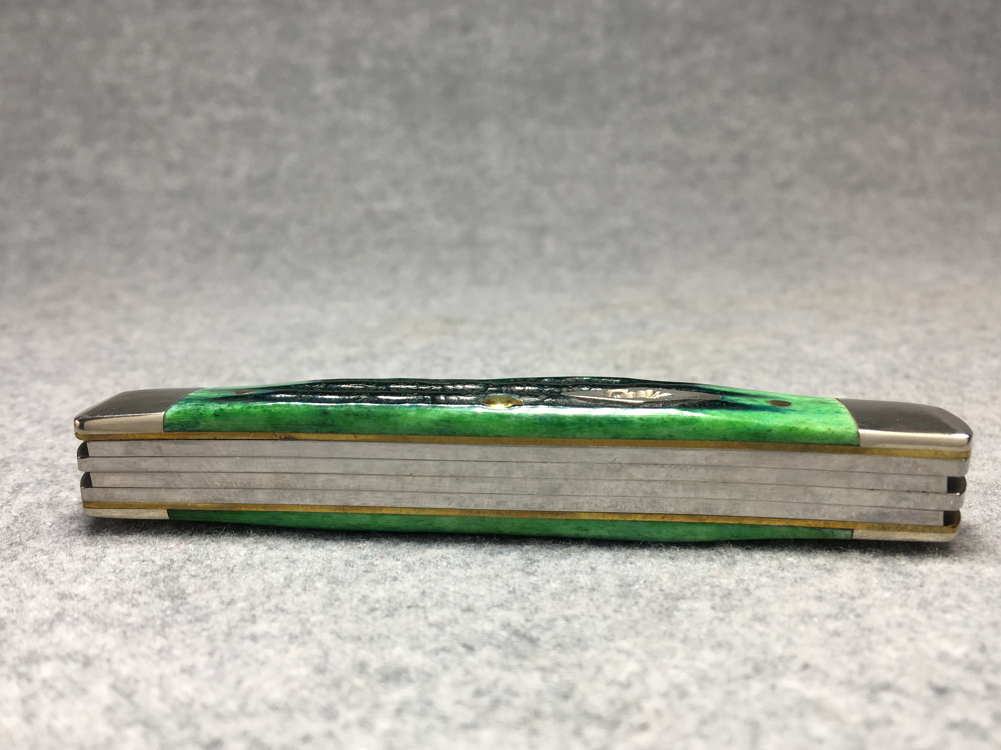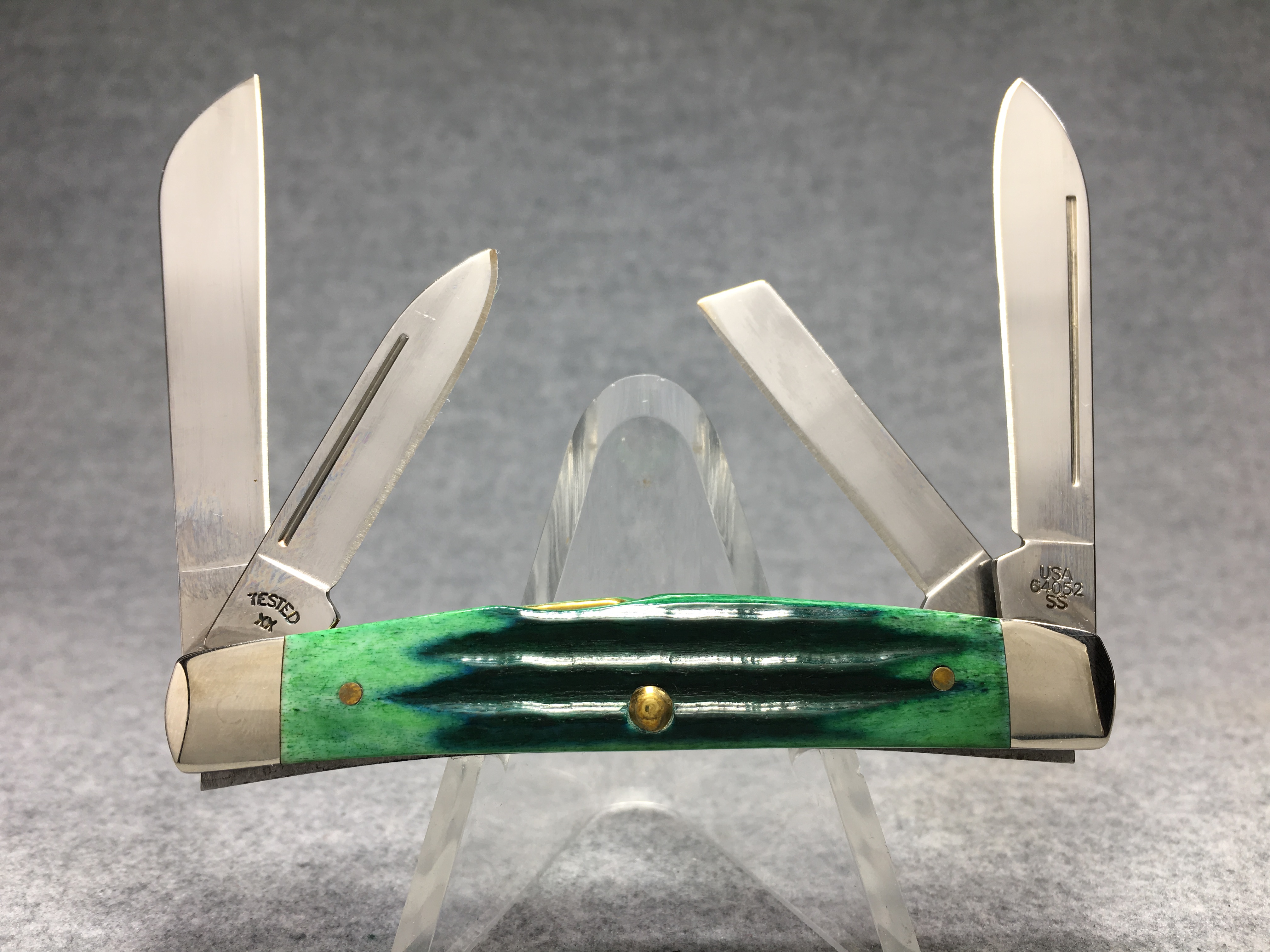 December 24, 2025 - 3-1/2 inches closed. 5-7/8 inches open. Made in USA. "  x x x  Case XX  *x*x*   " (with lightning bolt S), "SS", "TESTED XX", and "USA 64052 SS" tang stamps. Diamond closed-C script "Case xx" shield. Stainless Steel blades. Kentucky Bluegrass green/blue jigged bone handle. Nickel Silver bolsters. Brass liner.