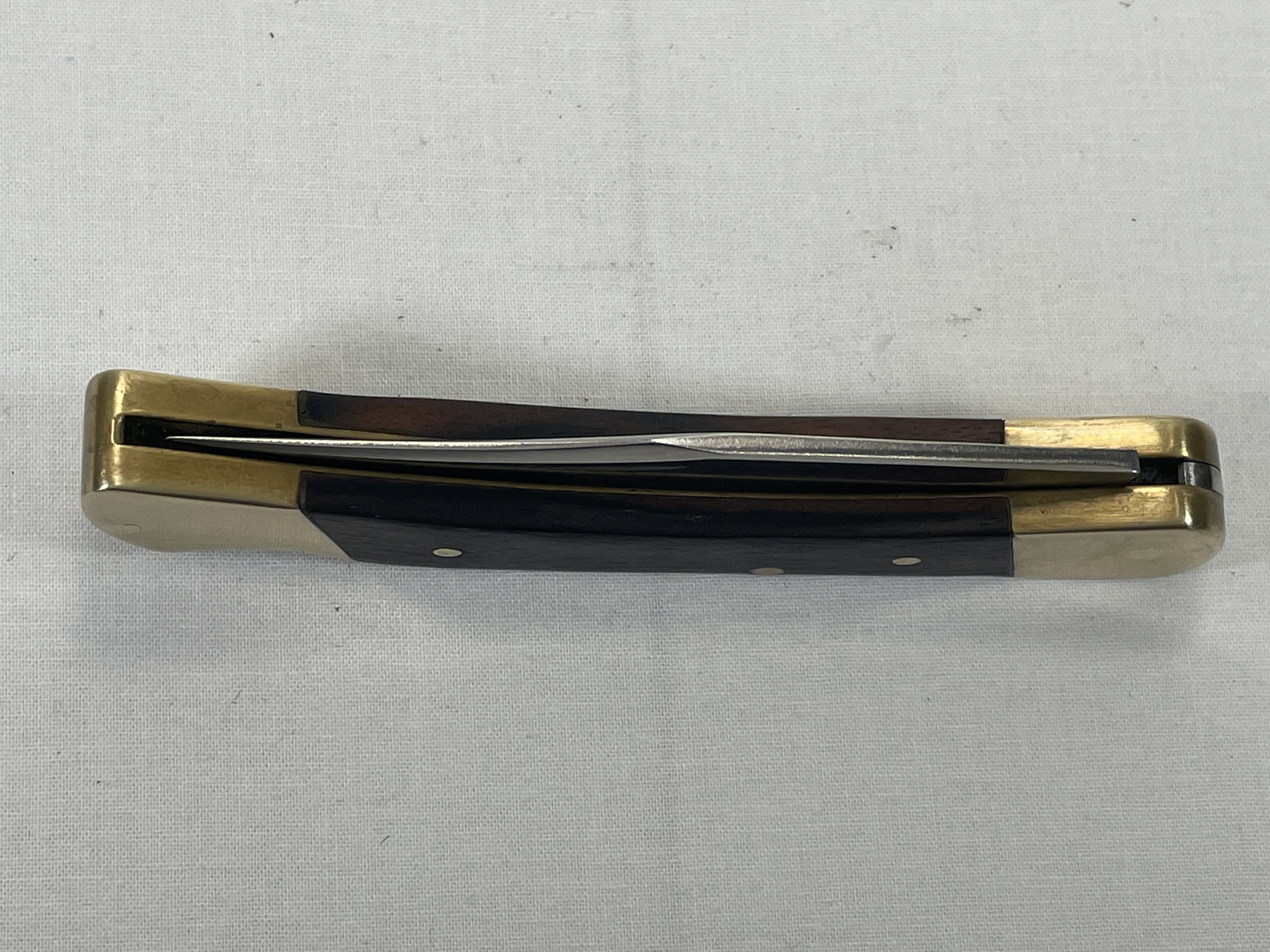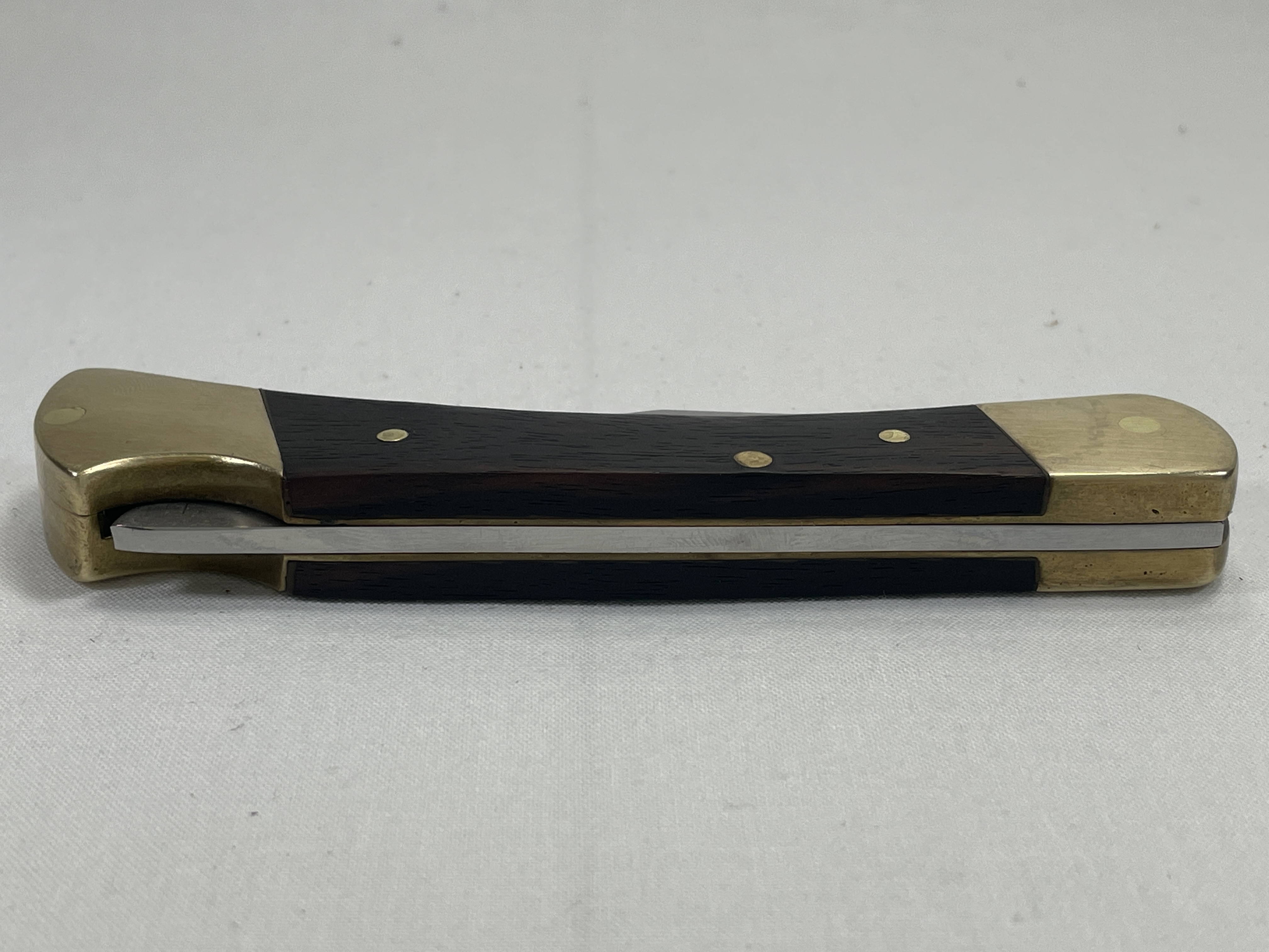 April 05, 2026 - 4-7/8 inches closed. 8-5/8 inches open. Made in USA. Front Tang: BUCK U.S.A. Stainless Steel blade. Brown Wood handle. Brass bolsters. Brass liner.