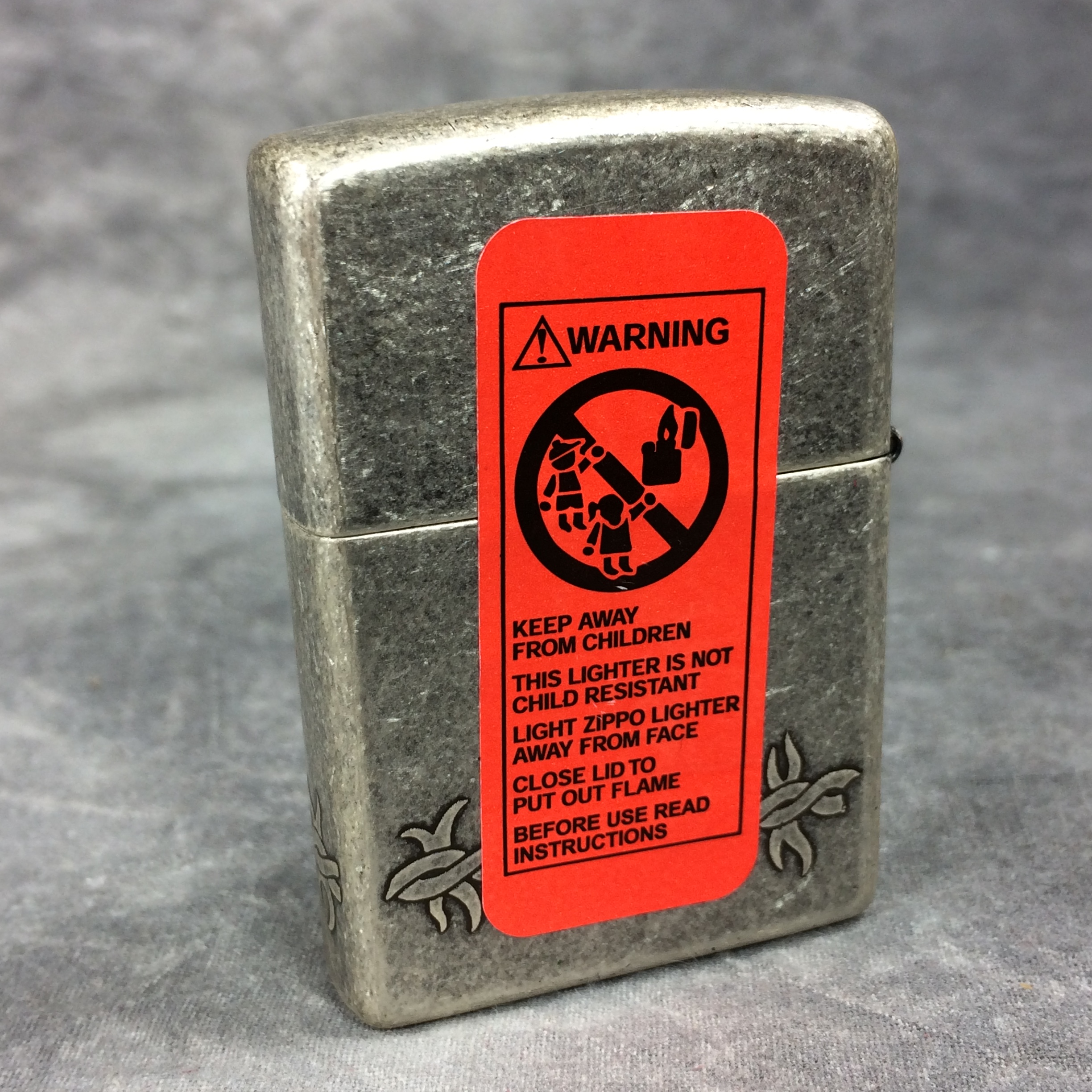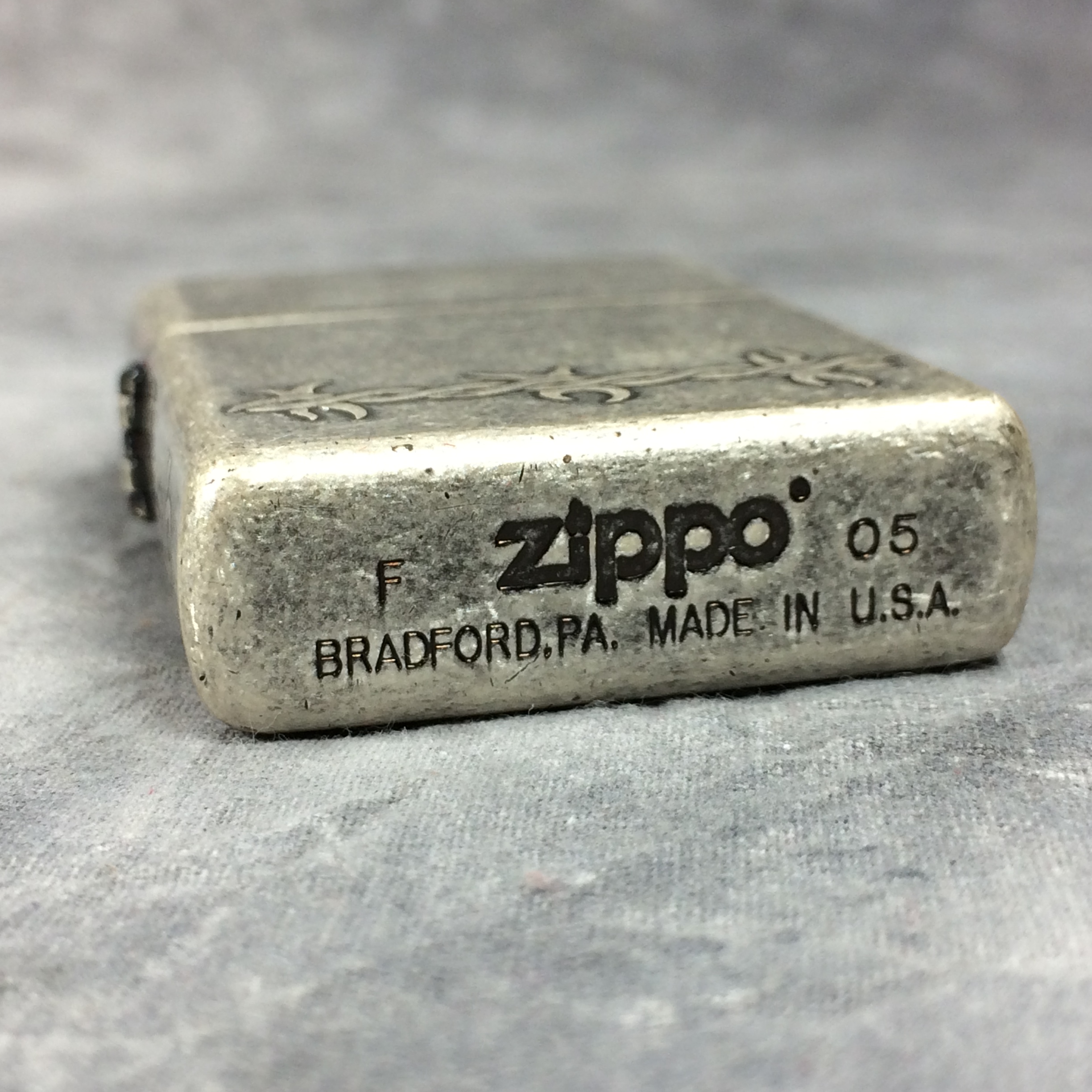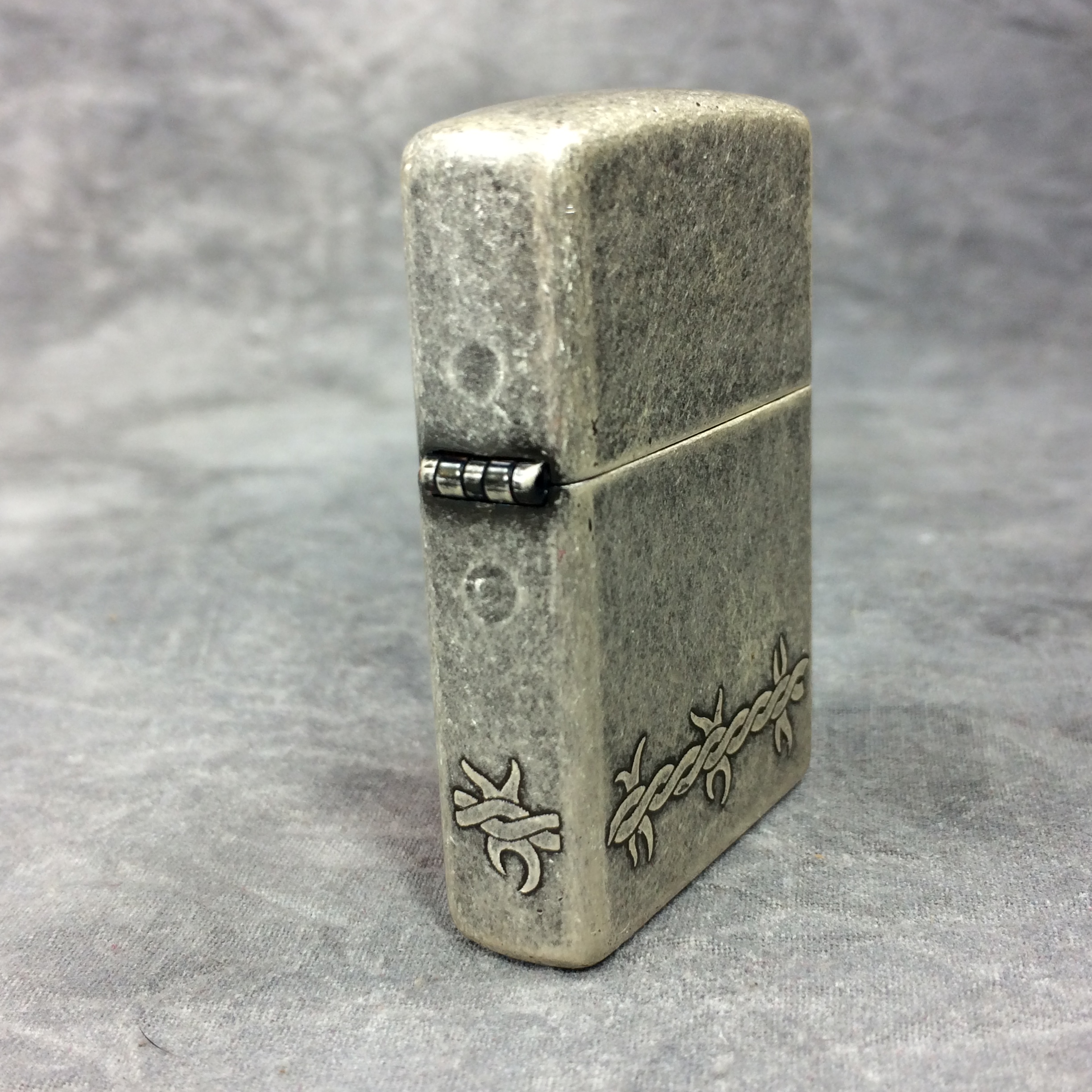 April 05, 2026 - ZIPPO Lighter, 2005. Antique Silver Plate finish with barbed wire design on front, back, and both sides. Standard size 1-7/16 inches wide by 2-1/4 inches high. Bottom of lighter reads: I Zippo 05 Bradford, PA Made in U.S.A.
