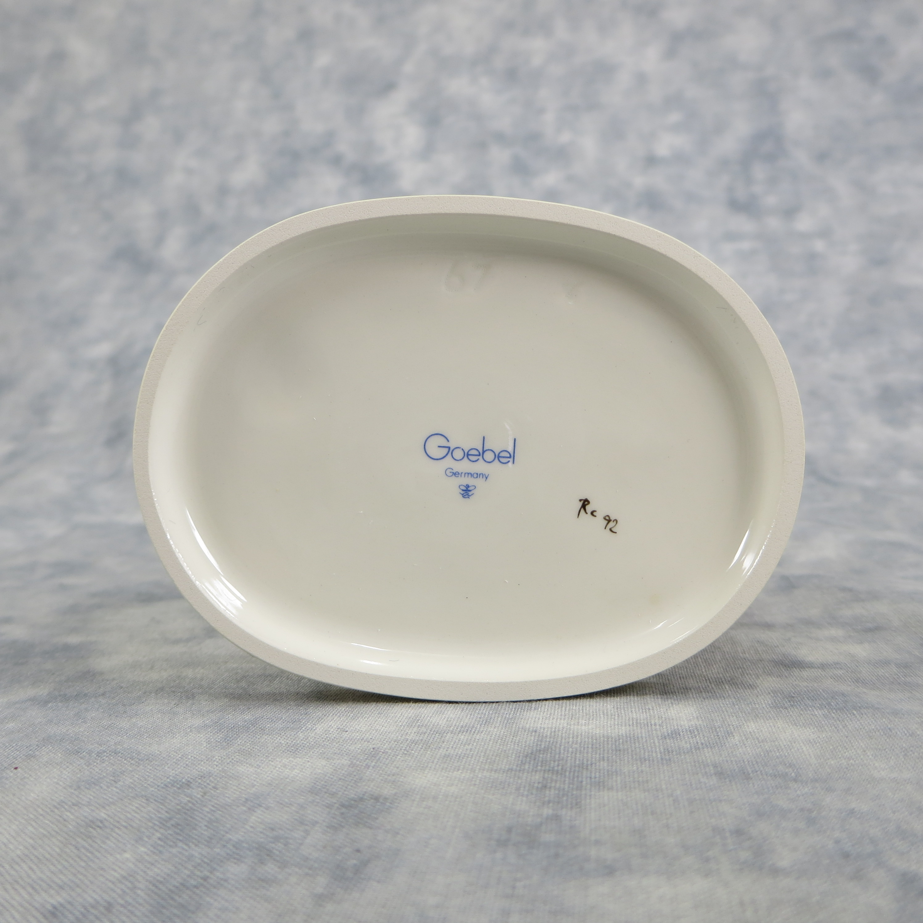 October 28, 2025 - 4-1/2 inches tall. Base incised 67. Goebel TMK 7 trademark imprinted in blue on bottom of base. painter hand-initialed and dated in black ink on bottom of base.