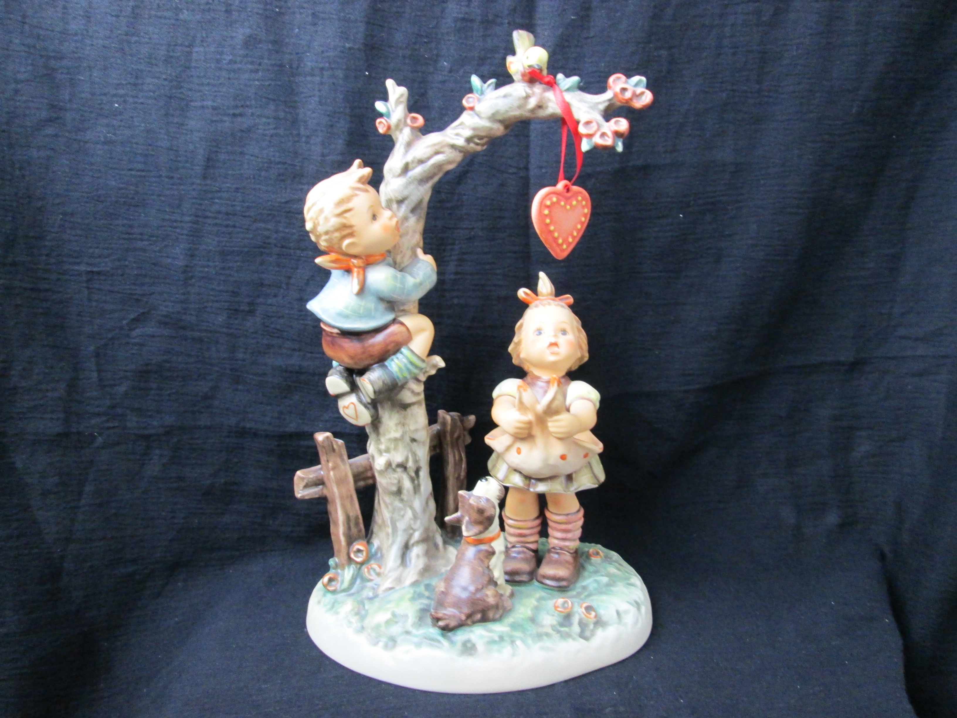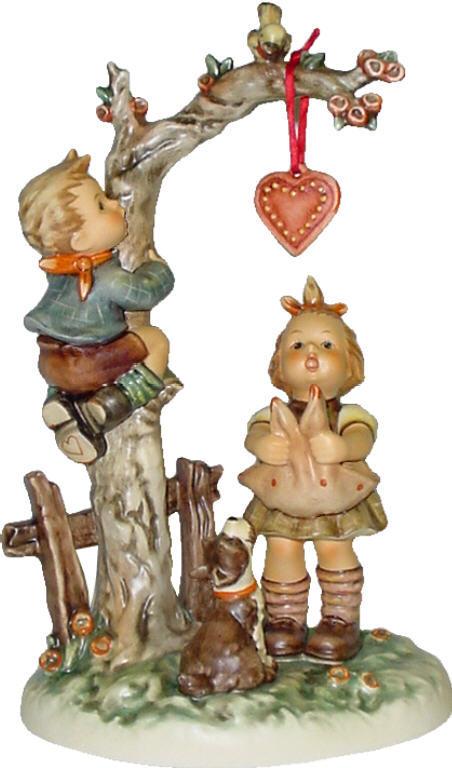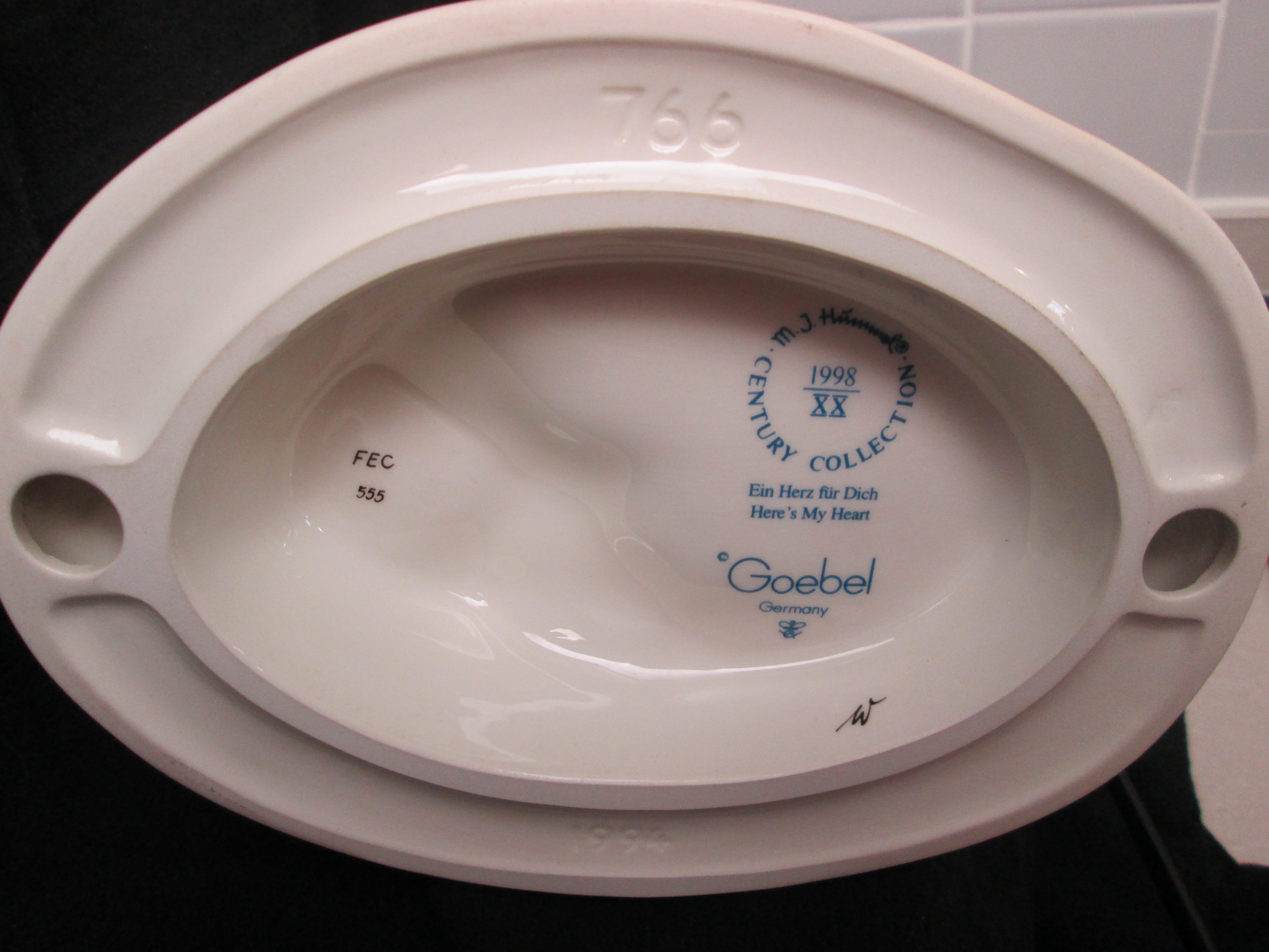 April 25, 2026 - Century Collection. 10 3/4 inches tall. Includes separate heart pendant on ribbon. Base is incised 766 and 1994. Goebel TMK 7 trademark and M.J. Hummel Century Collection 1998 and Ein Herz fur Dich Here's My Heart imprinted in blue on bottom of base. Artist hand initialed and numbered in black ink.