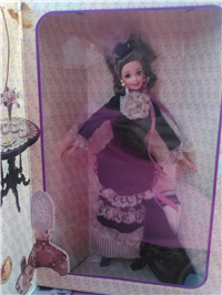 Scottish Barbie doll is a vision of national pride in this patriotic costume. She wears a long plaid skirt, a black blouse with lacy trim, with a matching plaid sash across her chest Her long wavy red hair cascades over her shoulders, and is crowned with a Scottish beret-style hat.