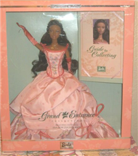 Princess of India Barbie doll is awe-inspiring in her sari, the best-known type of Indian clothing. Made of soft shimmering materials, this extraordinary pink sari features golden accents and is draped around her body and over her head in an intricate style. Like some princesses, she wears a golden headpiece called a tikka, a forehead ornament. The tikka hangs above her bindi, the dot on her forehead. A golden choker and earrings complete this wonderful costume.