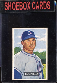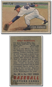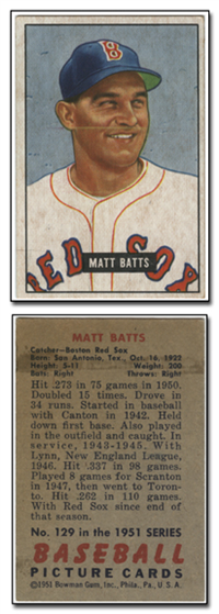 In 1951, Bowman increased the number of cards in its set for the 3rd consecutive year when it issued 324 cards. The cards are, like 1950, color art reproductions of actual photographs but now measure 2-1/16" by 3-1/8" in size. The player's name is situated in a small, black box on the card front.