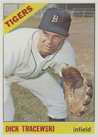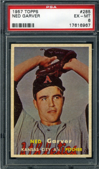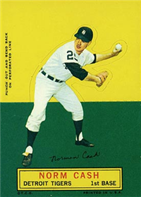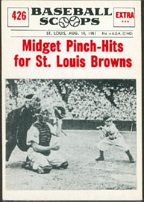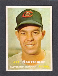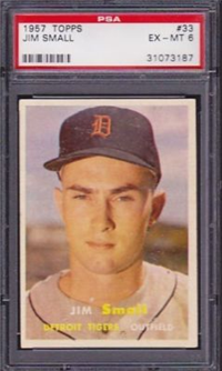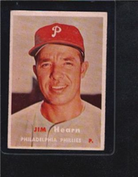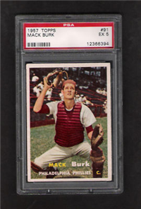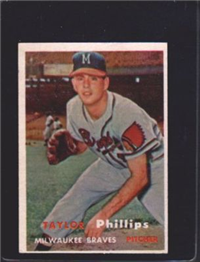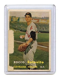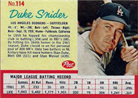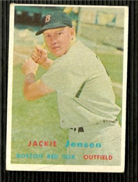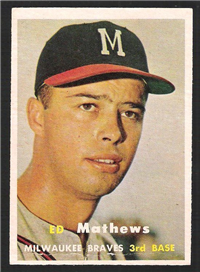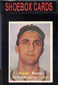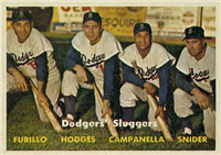For 1957, Topps reduced the size of its cards to the now-standard 2-1/2" by 3-1/2." Set size was increased to 407 cards. Another change came in the form of the use of real color photographs as opposed to the hand-colored black and whites of previous years. For the first time since 1954, there are also cards with more than one player. The two, "Dodger Sluggers" and "Yankees Power Hitters" began a trend toward the increased use of multiple-player cards. Another first-time innovation, found on the backs, is complete player statistics. The scarce cards in the set are not the highest numbers, but rather numbers 265-352. Four unnumbered checklist cards were issued along with the set. They are quite expensive and are not included in the complete set prices quoted below.