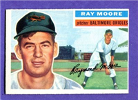 Card #43 from the 1956 Topps Baseball series features Ray Moore, a right-handed pitcher for the Baltimore Orioles, depicted in the distinctive dual-image format characteristic of the set, with a portrait alongside an action pose against a ballpark backdrop. The card presents vivid, lithographed color artwork with Moore’s facsimile signature printed across the lower portion. Topps, established in 1938 and entering the baseball card market in 1951, produced the 1956 series as one of its most visually appealing issues, notable for its horizontal layout and full-color illustrations, representing a significant period in post-war sports collectibles history.