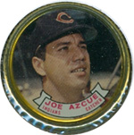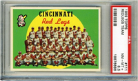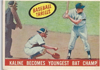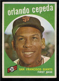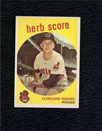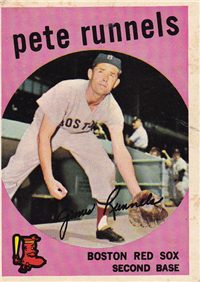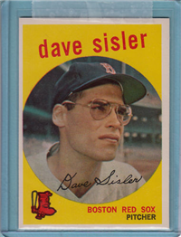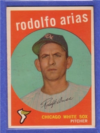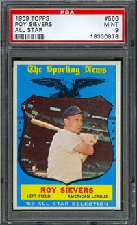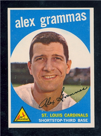 This card is one of 572 cards issued in the 1959 Topps card set--a set marking the largest set issued to that time. The cards in this set measured 2-1/2" by 3-1/2" and they have a round photograph at the center of the front with a solid-color background and white border. A facsimile autograph is found across the photo. Card numbers below #507 have red and green printing with the card numbering white in a green box. On card numbers 507 and higher, the printing is black and red and the card number is in a black box. Specialty cards include multiple-player cards, team cards with checklists, "All-Star" cards, highlights from previous season, and 31 "Rookie Stars". There is also a card of the commissioner, Ford Frick, and also one of Roy Campanella in a wheelchair. A handful of cards can be found with and without lines added to the biographies on the back indicating trades or demotions; those without the added lines added to the rare and valuable and are not included in the complete set price. Card numbers 199 through 286 can be found with either white or grey stock being the less common.