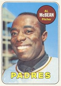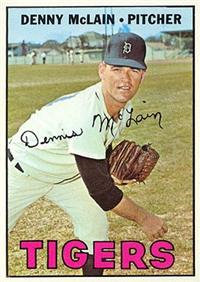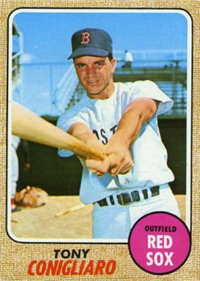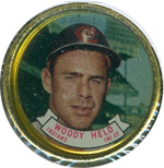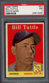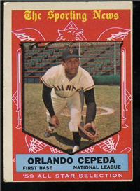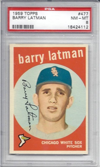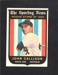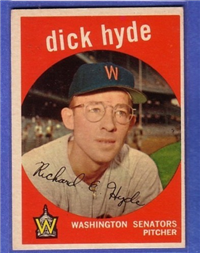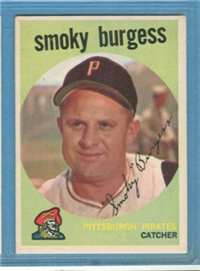 This card is one of 572 cards issued in the 1959 Topps card set--a set marking the larges tset issued to that time. The cards in this set measured 2-1/2" by 3-1/2" and they have a round photograph at the center of the front with a solid-color background and white border. A facsimile autograph is found across the photo. Card numbers below #507 have red and green printing with the card numbering white in a green box. On card numbers 507 and higher, the printing is black and red and the card number is in a black box. Specialty cards include multiple-player cards, team cards with checklists, "All-Star" cards, highlights from previous season, and 31 "Rookie Stars". There is also a card of the commissioner, Ford Frick, and also one of Roy Campanella in a wheelchair. A handful of cards can be found with and without lines added to the biographies on the back indicating trades or demotions; those without the added lines added to the rare and valuable and are not included in the complete set price. Card numbers 199 through 286 can be found with either white or grey stock being the less common.