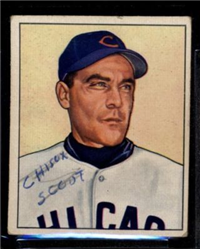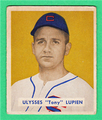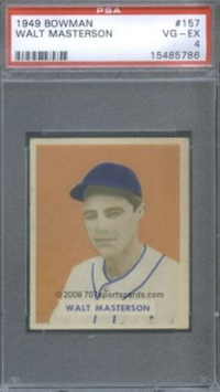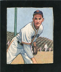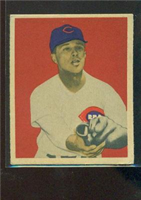 In 1949, Bowman increased the size of its issue to 240 numbered cards. The cards, which measure 2-1/16" by 2-1/2 inch are black and white photos over-printed with various pastel colors. Beginning with card #109 in the set, Bowman inserted the players' names on the card fronts. Twelve cards (#'s 4, 78, 83. 84, 88, 98, 109, 124, 127, 132 and 143), which were produced in the first four series of printings, were reprinted in the seventh series with either a card front or a back modification. These variations are noted in the checklist that follows. Card #'s 1-3 and 5-73 can be found with either white or grey backs. The complete set of value in the following checklist does not include the higher priced variation cards.
