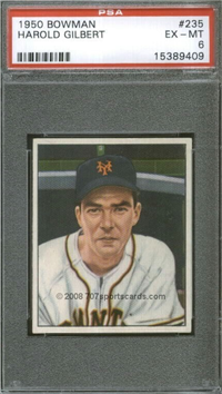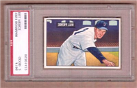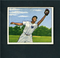 The quality of the 1950 Bowman issue showed a marked improvement over the company's previous efforts. The cards are beautiful color art reproductions of actual photographs and measure 2-1/16" by 2-1/2" in size. The card backs include the same type of information as found in the previous year's issue but are designed in a horizontal format. Cards found in the first two series of the set (#'s 1-72) are the scarcest in the issue. The backs of the final 72 cards in the set (#'s 181-252) can be found with or without the copyright line at the bottom of the card, the "without" version being the less common.