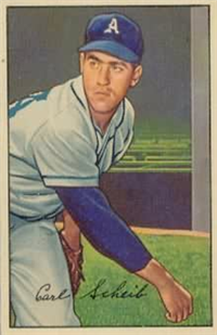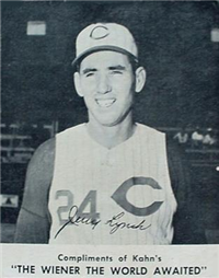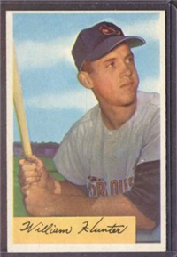 2 5/8" by 3 3/4" Unnumbered. Front: Colorized portraits, player's name, team and position at top, facsimile autograph and color image of package of Wilson Franks. Back: Personal biography, 1953 statistics and career statistics.