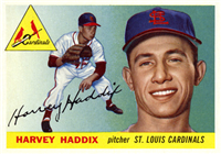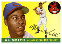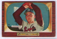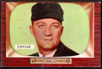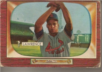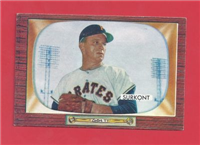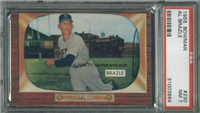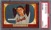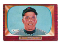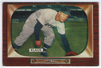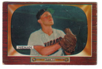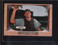 Bowman produced its final baseball card set as an independent card maker in 1955, a popular issue which has color player photographs placed inside a television set design. The set consists of 320 cards that measure 2-1/2" by 3-3/3" in size. High-numbered cards (#'s 225-320) appear to have replaced certain low-numbered cards on the press sheets and are somewhat scarcer. The high series includes 31 umpire cards.