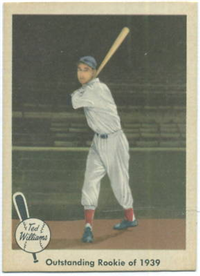 The 80-card 1959 Fleer set tells of the life of baseball great Ted Williams, from his childhood years up to 1958. The full-color cards measure 2-1/2" by 3-1/2" in size and make use of both horizontal and vertical formats. The card backs, all designed horizontally, contain a continuing biography of Williams. Card #68 was withdrawn from the set early in production and is scarce. Counterfeit cards of #68 have been produced and can be distinguished by a cross-hatch pattern which appears over the photo on the card fronts