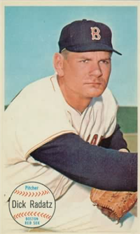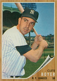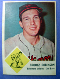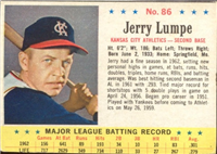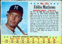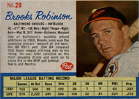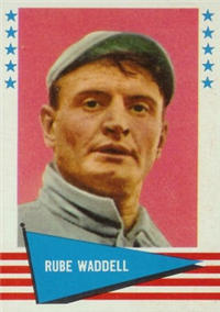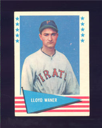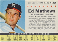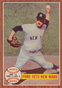 Over a two year period, Fleer issued another set utilizing the Baseball Greats theme. The 154-card set was issued in two series and features a color player portrait against a color background. The player's name is located in a pennant set at the bottom of the card. The card backs feature orange and black on white stock and contain player biographical and statistical information. The cards measure 2-1/2"by 3-1/2" in size. The second series cards (#'s 89-154) were issued in 1962.