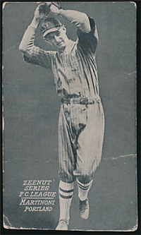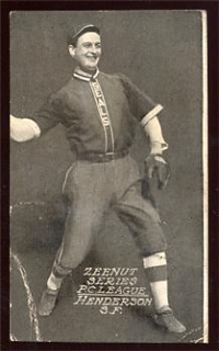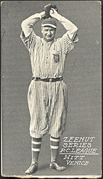 The second series of Zeenut cards measure 2 1/8" x 4 1/8" high and featured sepia-toned photographs on a brown background with no border. Most cards have blank backs, but some have been found with printing advising collectors to "save Zeenut pictures for valuable premiums." The checklist consits of 158 subjects, but more cards are still being discovered.