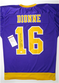 This is a size XL Los Angeles Kings #17 Jersey signed by Marcel Dionne himself and authenticated by James Spence Authentication, LLC. Everything is sewn on the jersey. It is hand-signed in black felt tip pen. The jersey is in near mint to mint condition and is accompanied by its certificate of authenticity and hologram with matching W739722 number.