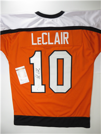 This is a size L Philadelphia Flyers #10 Jersey signed by John LeClair himself and authenticated by James Spencer Authentication, LLC. Everything is sewn on the jersey. It is hand-signed in black felt tip pen. The jersey is in near mint to mint condition and is accompanied by its certificate of authenticity and hologram sticker with matching W601243 serial number.