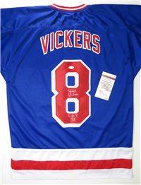 This is a size XL New York Rangers #8 jersey signed by Steve Vickers himself and authenticated by James Spencer Authentication, LLC. Everything is sewn on the jersey. It is hand-signed in black felt tip pen. The jersey is in near mint to mint condition and comes with Certificate of Authenticity and hologram sticker with matching W739097 serial number.