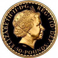 This gold coin was issued on April 21, 1976 to commemorate the 50th birthday of Queen Elizabeth II, reigning monarch of the British commonwealth at the time. It is the first gold coin issued anywhere in the word to honor Her Majesty's 50th birthday. The face of the coin bears the portrait of Queen Elizabeth by Arnold Machin. The reverse combines the Coat of Arms of the British Virgin Islands, the Royal Cypher of H.M. Queen Elizabeth II, and the legend 50TH BIRTHDAY.