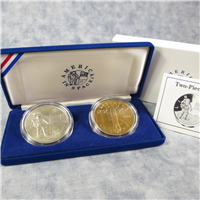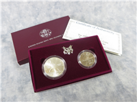 Includes silver one dollar coin and clad half dollar coin. The silver dollar is comprised of 90% silver. The half dollar coin copper and nickel. The set was issued by the US Mint in an official display box with a certificate describing the coins.