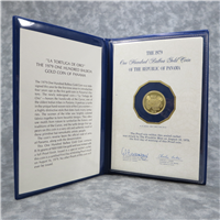26 mm diameter first-day-of-minting proof coin containing 8.16 grams of 900/1000 fine gold. Minted in limited edition by The Franklin Mint. This coin is legal tender of the Republic of Panama. This coin was issued to honor the handicrafts of the Cunas, one of the oldest Indian tribes in Panama.