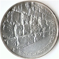 37mm diamter. ~26 grams .900 silver. Obverse: Artistic star-like design with a sprig wrapped around the sword with text below. Reverse: Wailing Wall with text around bottom. Edge Description: 28 Iyar-2 Sivan 5727" and small stars"