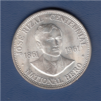 39 mm diameter, reeded edge. ,26 grams of .900 silver. 100th Anniversary Birth of Dr. Jose Rizal. Obverse: Shield of arms; Reverse: Bust 1/4 right divides dates.