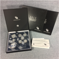 This collection, struck at the San Francisco Mint, contains the following 90% silver proof coinage: Chief Justice John Marshall dollar, Marine Corps 230th Anniversary dollar, 5 state quarters, Kennedy half dollar and Roosevelt dime as well as the Lincoln penny, Sacagawea dollar and two nickels from the Westward Nickel Series.