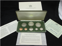 This special 1977 coinage is the first sterling silver Proof Set ever issued by the British Virgin Islands. This set commemorates the 25th anniversary of the reign of Her Majesty Queen Elizabeth II of Great Britain. This coin of the realm set is an authentic proof set of the 1977 coinage of the British Virgin Islands. It was minted by The Franklin Mint under the authorization of the Government of the British Virgin Islands. Certified December 6, 1976. All of the coins in this set are solid sterling silver. The combined total silver weight is approximately 62.93 grams of .925.