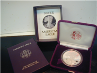 Includes American Eagle uncirculated silver dollar, one troy ounce of pure .999 fine silver, in original velvet display case and US Mint box, with certificate of authenticity.