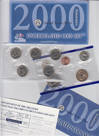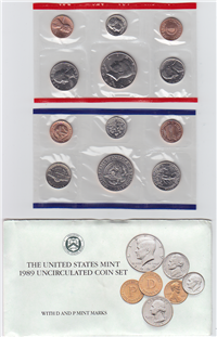 Denver and Philadelphia Mints. Face value: $1.82. Includes P and D Kennedy half dollar, Washington quarter, Roosevelt dime, Jefferson nickel, and Lincoln cent. Each set sealed in original cellophane wrapper and housed in color US Mint envelope with full color specifications card.