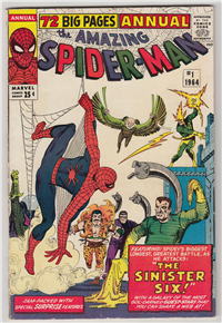 Stan Lee, Steve Ditko. Origin retold: Spider-Man. First appearance of the Sinister Six in "The Sinister Six!", Early X-Men appearance. Thor, Giant-Man, Wasp, Dr. Strange, and Fantastic Four cameos.