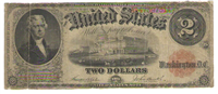 4-3/8 inches x ~2-3/16 inches. White paper on obverse (front). Black with red seal. Green back. Bust of William H. Crawford, left. Series of 1875. Engraved by Bureau of Engraving & Printing.