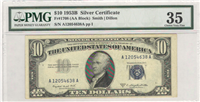 3-3/4 inches x ~1-7/8 inches. Black with large red seal, violet silk fibers. Green back. Bust of George Washington, left. Dated March 3d, 1863. Engraved by American Bank Note Company.