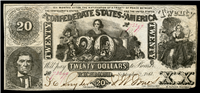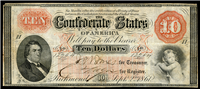 514,400 issued. Black with vermillion X X overprint. Blank back. Hope with anchor at center, R.M.T. Hunter left, C.G. Memminger right. Lithographic date, 'September 2, 1861'. Printed by Keatinge & Ball, Richmond, Va. Contemporary counterfeits are known and are of similar value.