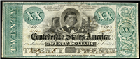 1,950,400 issued. Black. Fancy green back. Lucy Pickens center, two soldiers left, George W. Randolph right. Serial number machine-numbered in red ink. Lithographed date, '6th April, 1863'. Engraved by Keatinge & Ball, Columbia, S.C. Contemporary counterfeits are known and highly valued by collectors. Beware: a modern counterfeit with serial number 84C has no value.