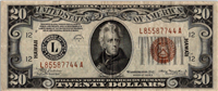 The State National Bank of Corsicana Texas. 6-1/2 inches by 2-1/2 inches. Black with brown seal. Green back. Bust of Andrew Jackson, center. Signatures of Jones and Woods. Charter number in heavy black ink and in brown ink in two places on face of note.